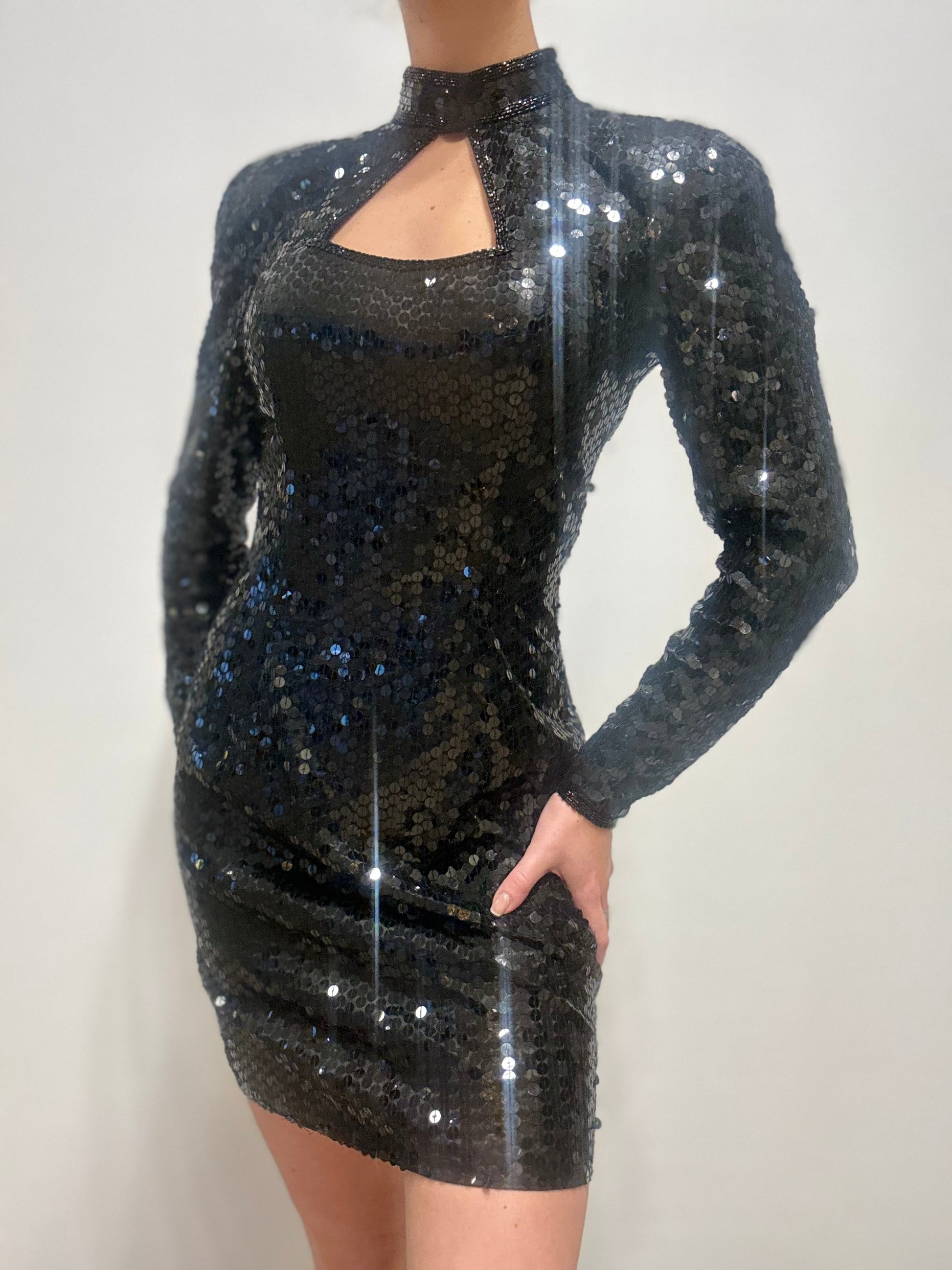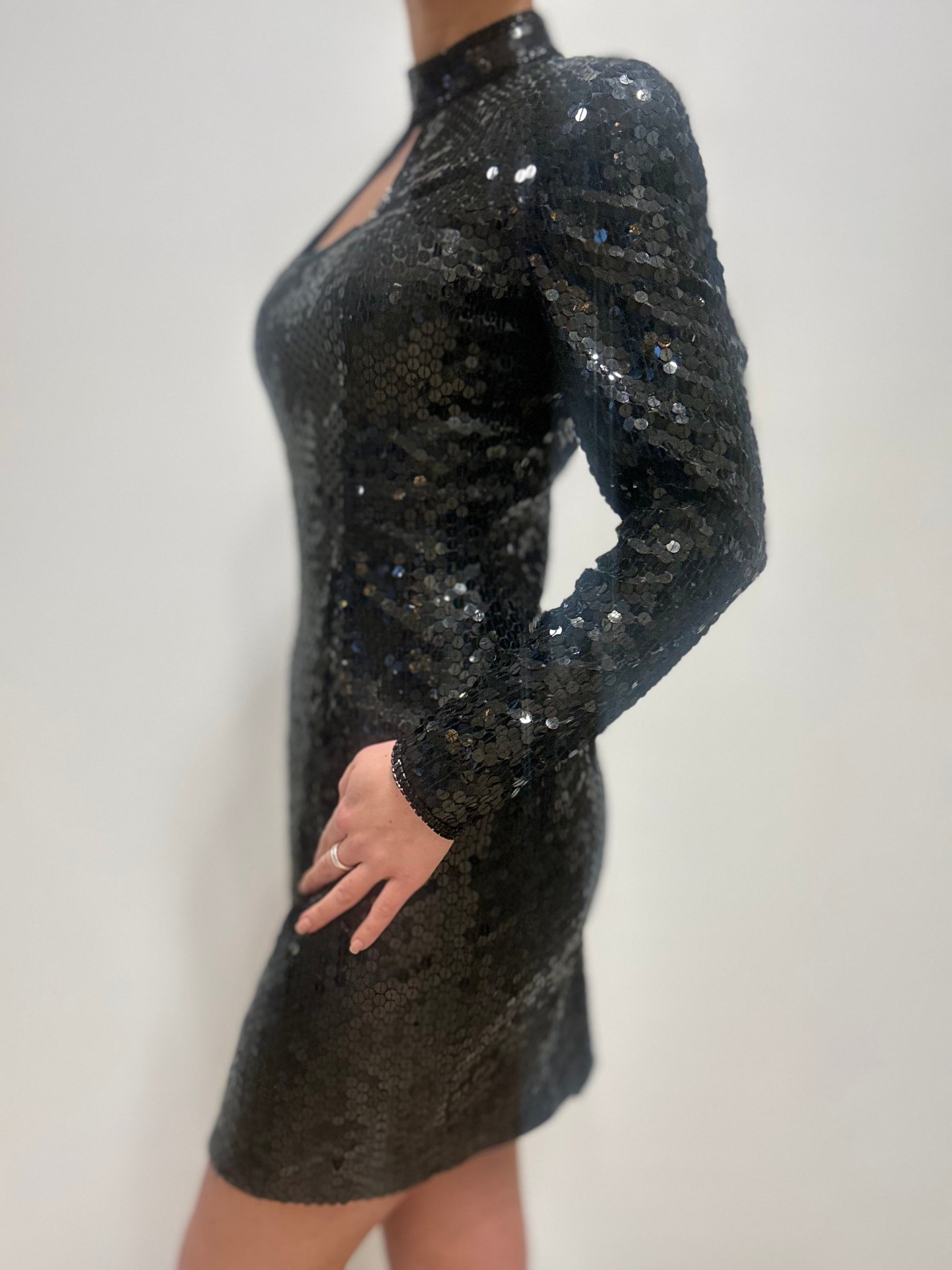 Maak een statement met deze prachtige, volledig met pailletten bezette jurk. De aangesloten pasvorm, subtiele schouderaccenten en elegante keyhole-uitsnede aan de voorkant geven de jurk een vrouwelijke en krachtige uitstraling. De achterkant heeft een chique open detail dat het geheel extra bijzonder maakt. Perfect voor feestdagen, gala’s of elke avond waarop je wilt stralen.
