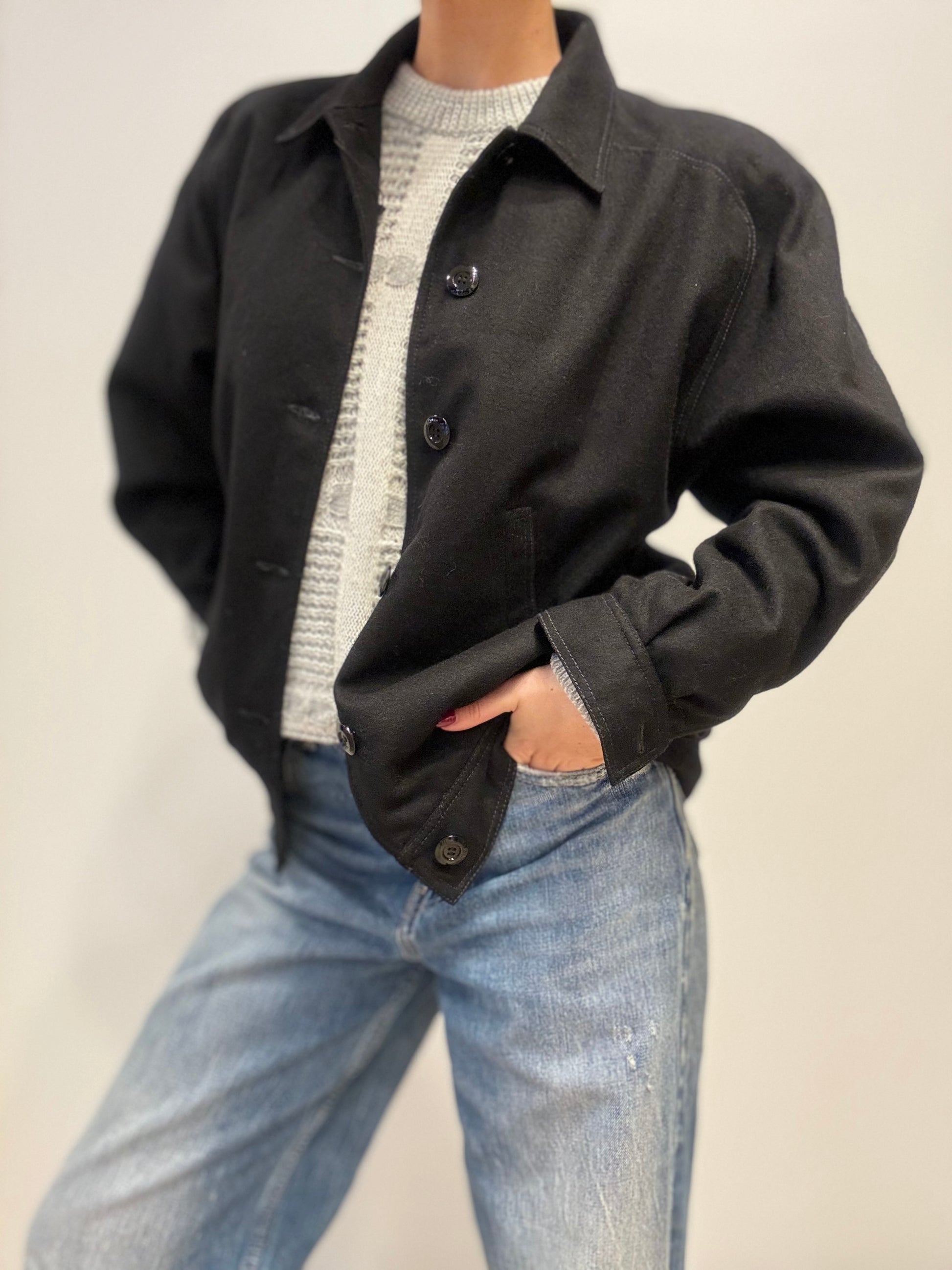 Deze vintage wollen bomber jas in diepzwart is een tijdloos item met een moderne, minimalistische uitstraling. Gemaakt van een zachte wolmix, biedt hij warmte en structuur zonder aan stijl in te boeten. Het korte, rechte silhouet en de klassieke kraag met knoopsluiting geven de jas een subtiel masculine look die moeiteloos te combineren is met jeans of een wollen broek.