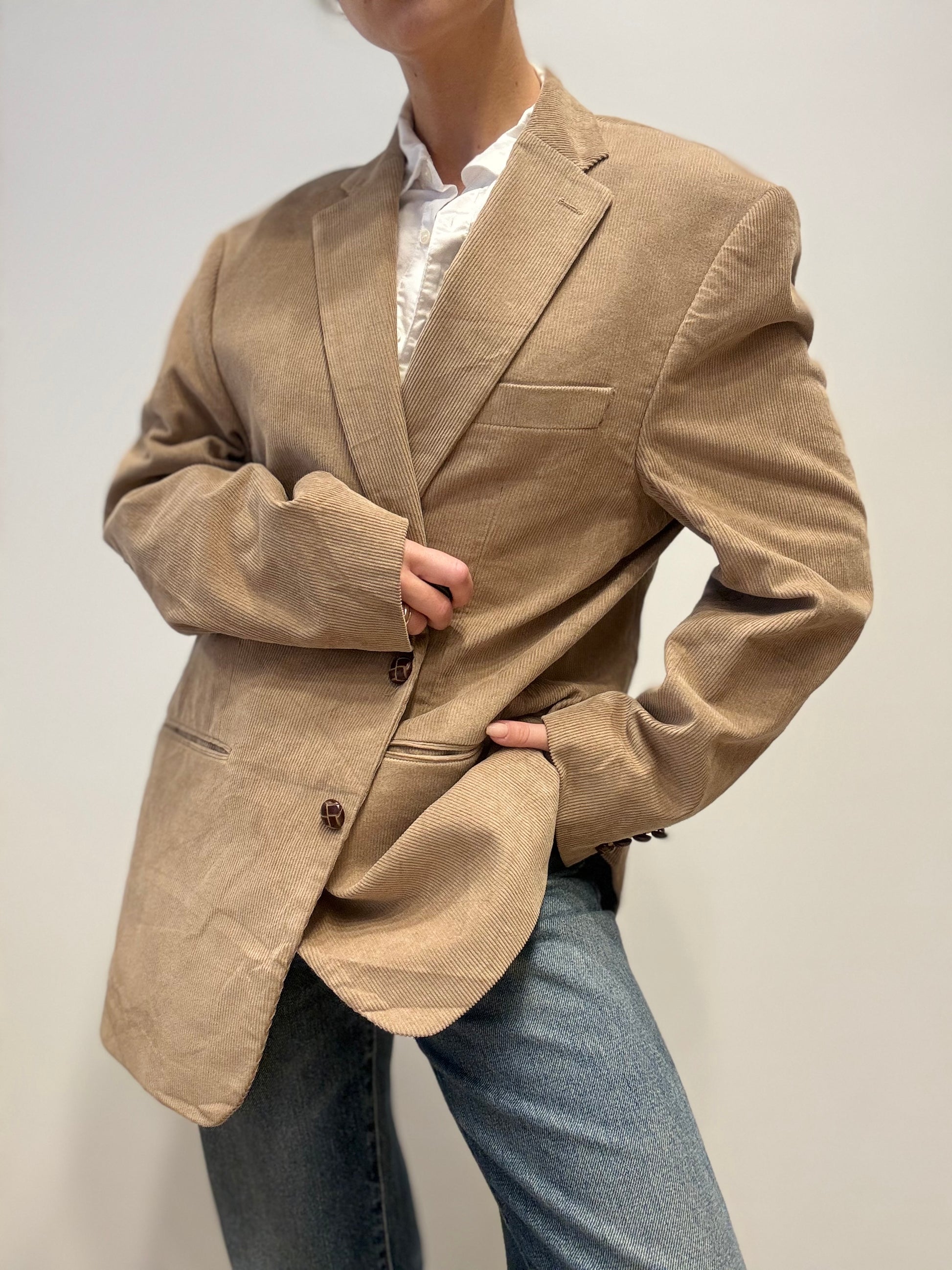 Deze tijdloze vintage blazer is gemaakt van 100% katoenen ribfluweel in een warme karamelbeige tint. Het ontwerp heeft klassieke tailoringdetails zoals een reverskraag, knopen aan de voorkant en functionele voorzakken, wat zorgt voor een elegante, vintage uitstraling. De contrasterende suède elleboogstukken voegen een authentiek, heritage-accent toe. Perfect om te dragen over een blouse of gebreide trui voor een stijlvolle, gelaagde look.