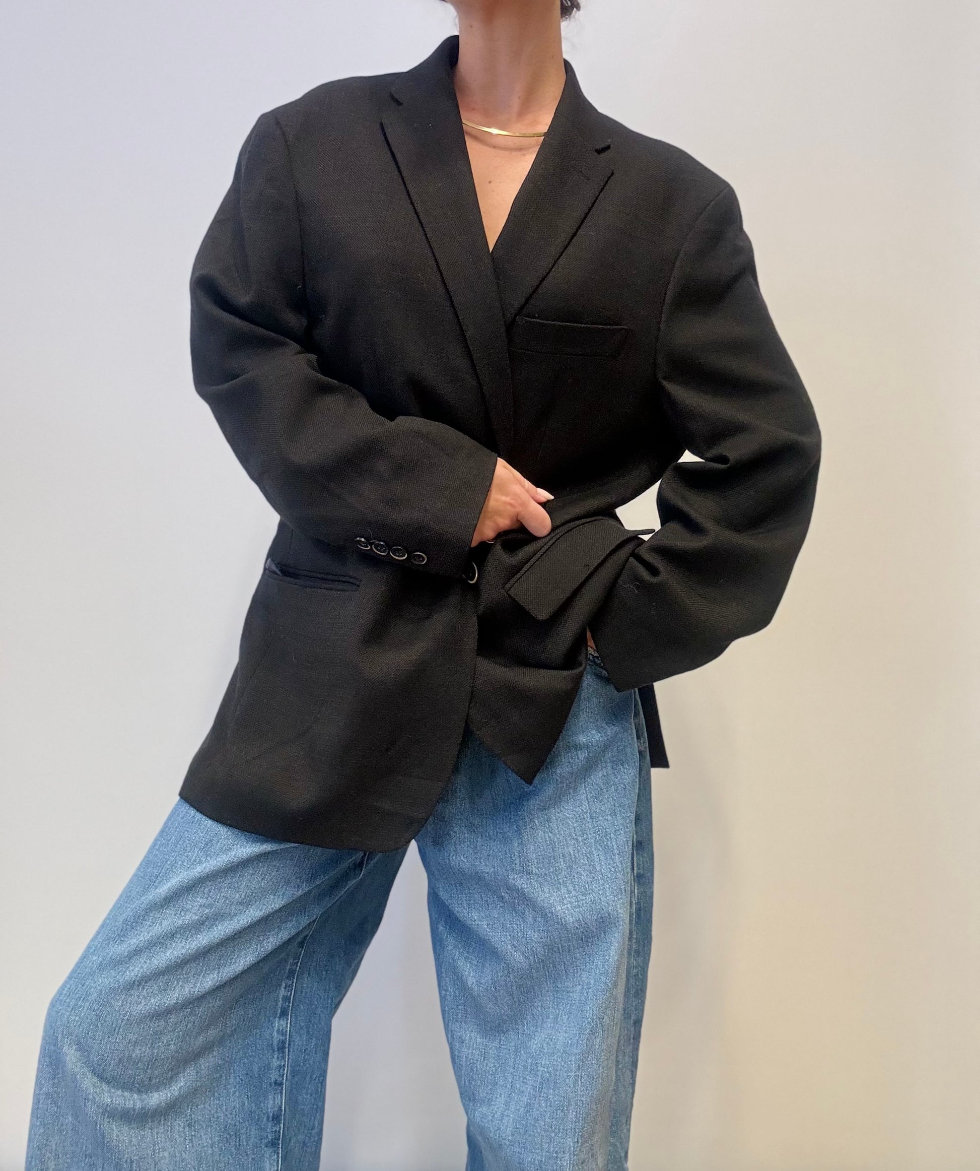 Deze authentieke vintage blazer van Tommy Hilfiger is gemaakt van 100% wol in een diepe zwarte tint en biedt een perfecte mix van klassieke tailoring en een moderne oversized look. De blazer heeft een single-breasted ontwerp met reverskraag, twee knopen en klepzakken aan de voorkant, wat zorgt voor een tijdloze en veelzijdige uitstraling. Draag hem casual met denim of combineer met een pantalon voor een meer verfijnde, eigentijdse stijl.