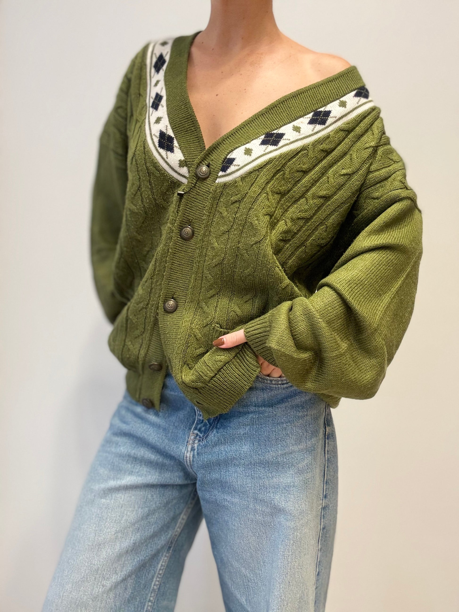 Vintage Olijfgroene Kabeltrui Cardigan met Ruitdetail