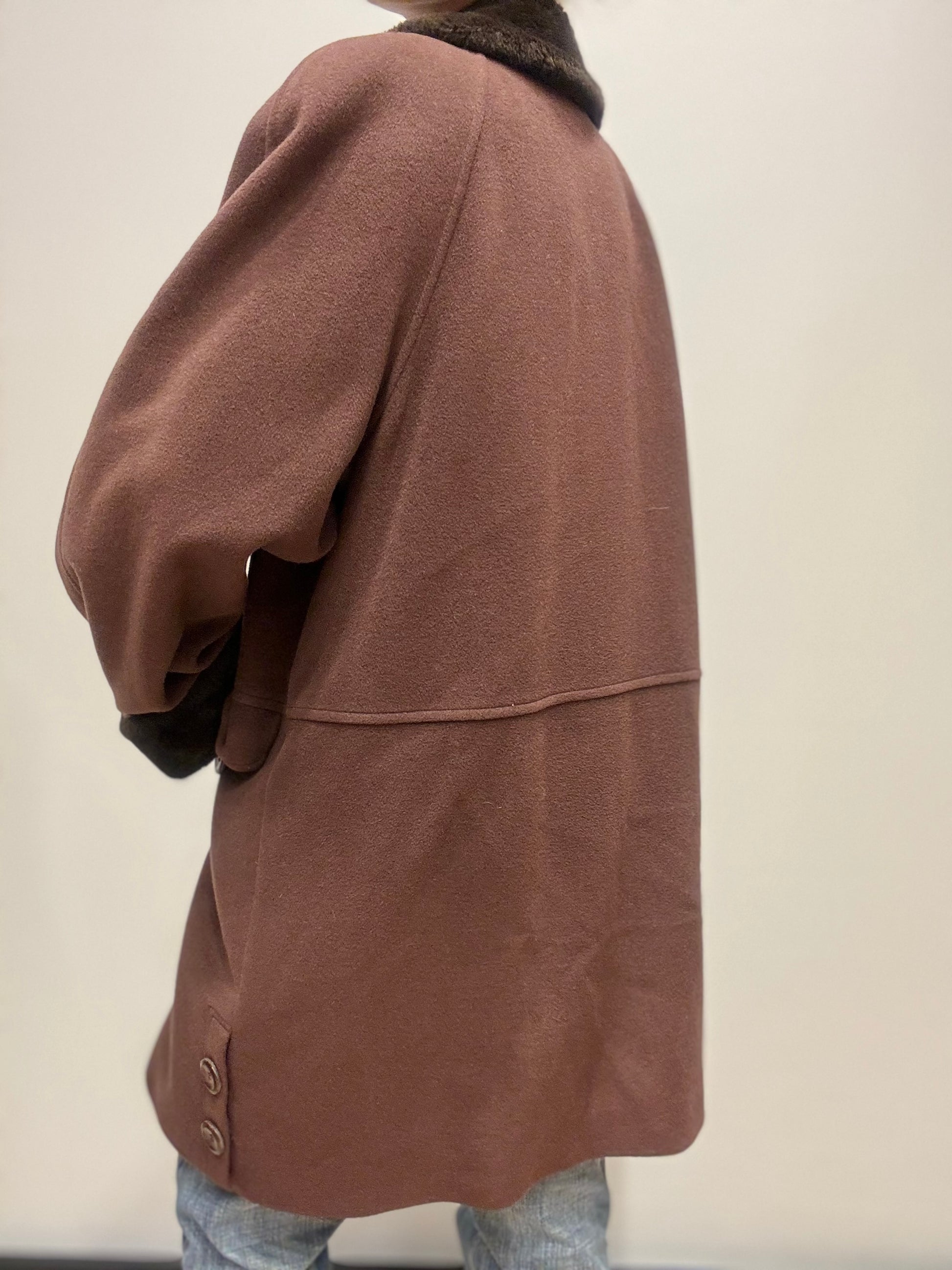 Stijlvolle bruine jas met luxe bontdetails aan de kraag en mouwen. De jas heeft een rechte, licht oversized pasvorm en straalt een klassieke maar krachtige uitstraling uit. Voorzien van klepzakken, knoopsluiting en een warme wollen stof, ideaal voor de koudere dagen.