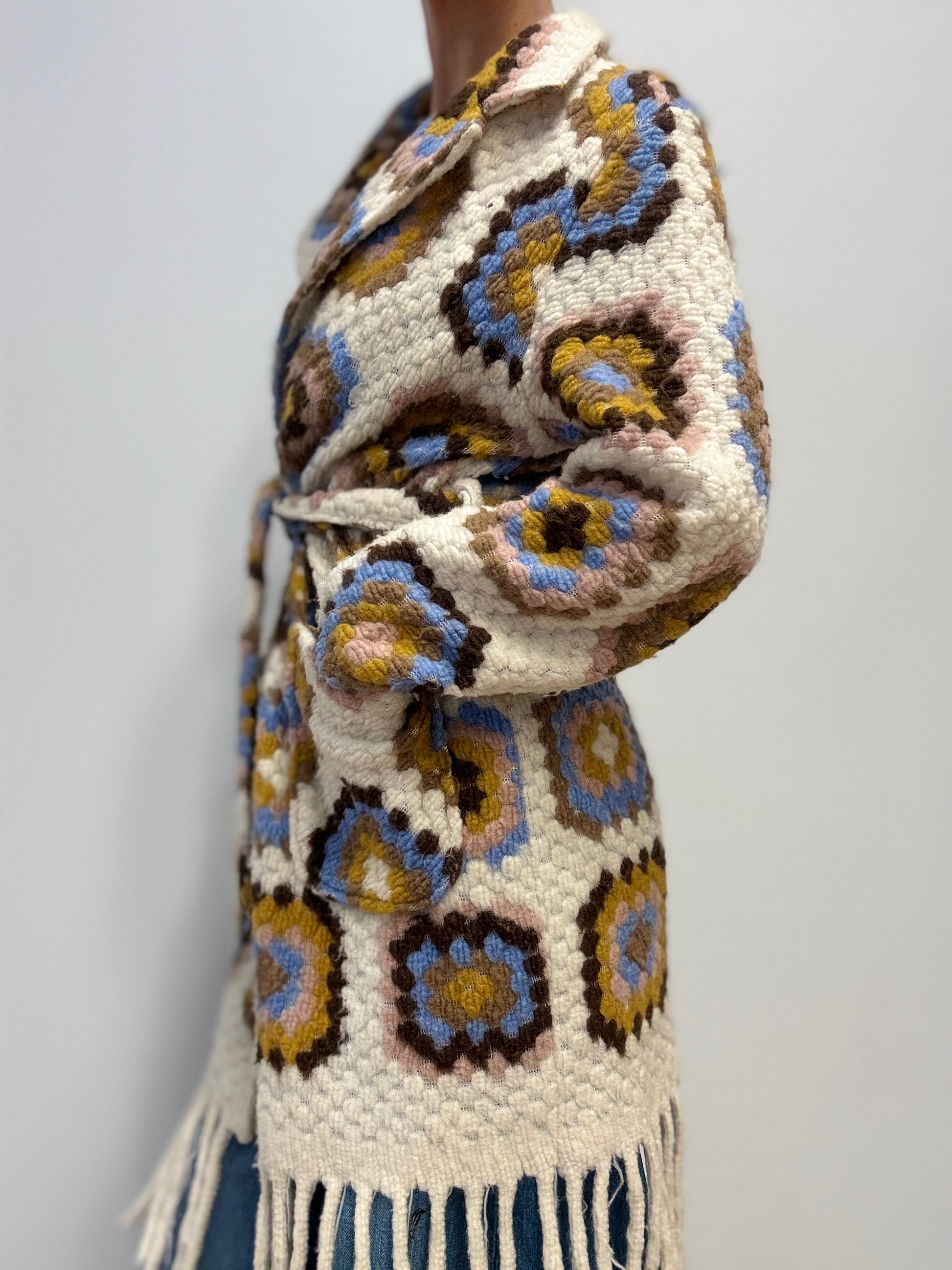 This beautiful vintage knitted coat is made from a soft wool-blend yarn (25% wool) in a cream base, detailed with a bold geometric pattern in shades of mustard, blue, brown, and blush. Designed with a shawl collar, matching belt, and fringed hem, it offers both warmth and effortless bohemian style — a perfect statement piece for cooler seasons.