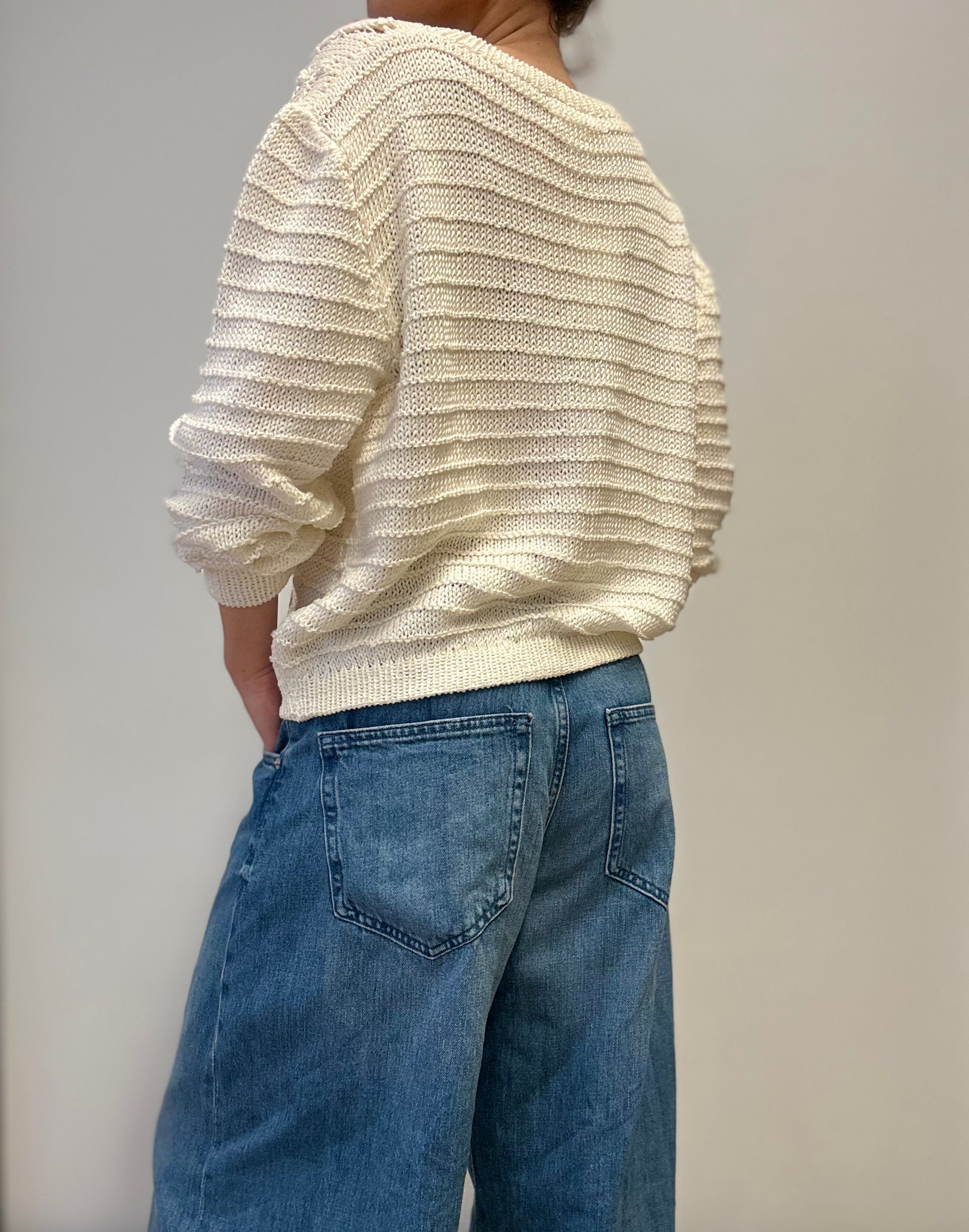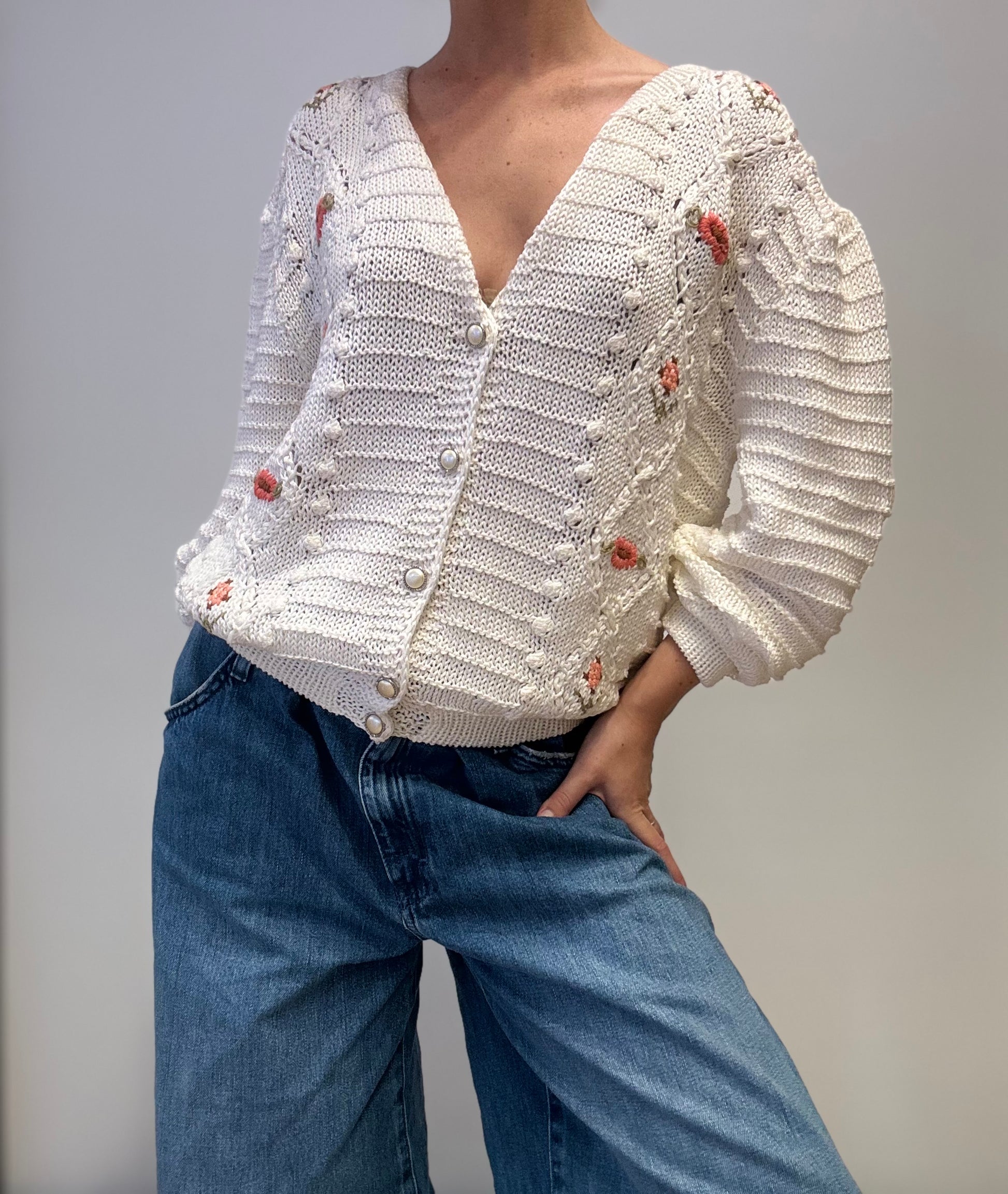 Dit authentieke vintage vest is handgemaakt in Italië van 100% katoen en heeft een verfijnde gebreide structuur met textuur en bobbelsteek-details. De crèmekleurige basis is versierd met handgeborduurde bloemenmotieven in zachte rood- en groentinten, wat zorgt voor een vrouwelijke en tijdloze uitstraling. Het vest sluit met parelmoerachtige knoopjes en heeft een iets korter, relaxed model – perfect om te dragen over jurken of een high-waisted jeans.