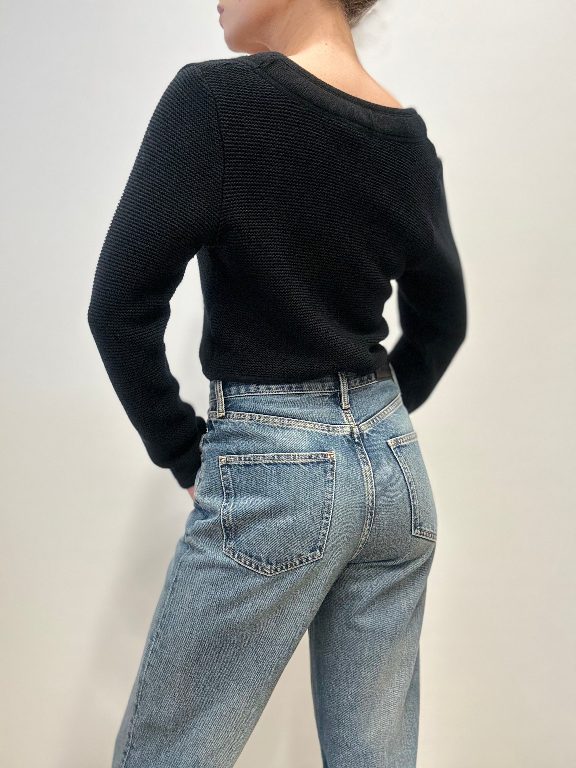 Vintage Zwarte Cropped Gebreide Cardigan met Sierknoop