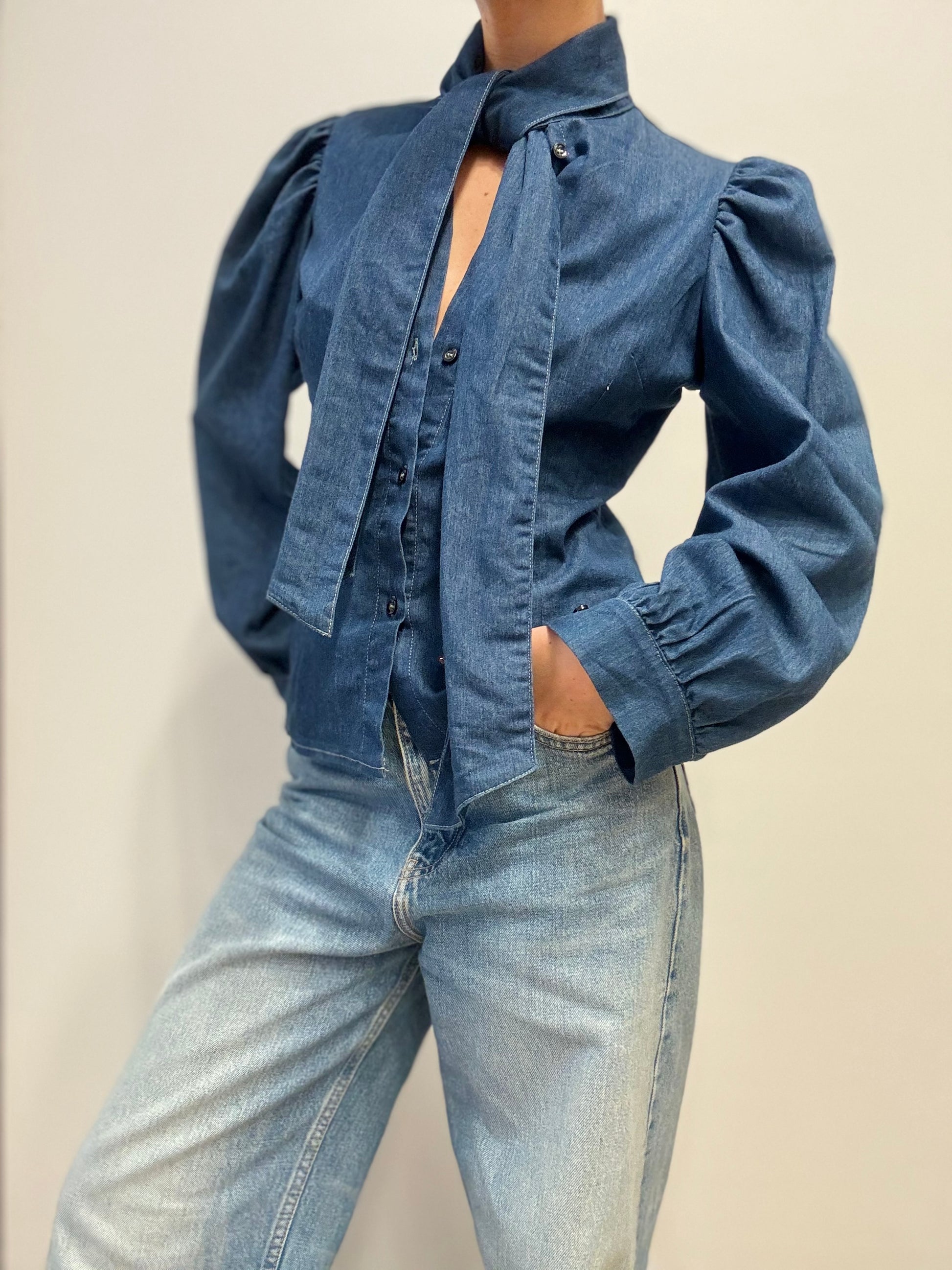 Een stijlvolle vintage denim blouse met een elegante twist: een lange striksluiting aan de hals en vrouwelijke pofmouwen. Deze blouse combineert het stoere karakter van denim met verfijnde, romantische details, waardoor het zowel casual als chic te dragen is. Perfect voor wie houdt van unieke, tijdloze stukken met karakter.