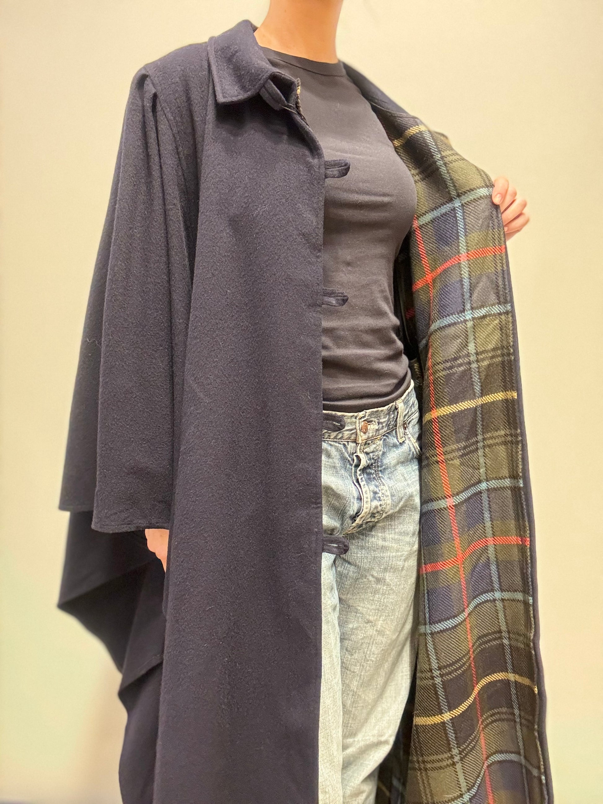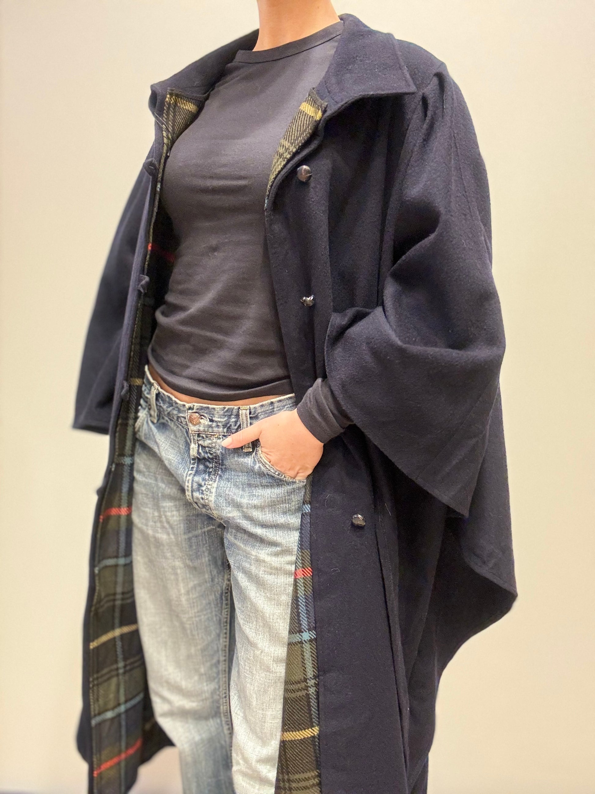 Deze donkerblauwe mantel heeft een losse, oversized pasvorm en een tijdloze uitstraling. De jas is voorzien van een klassieke kraag, knoopsluiting en een contrasterende ruitvoering aan de binnenzijde, die subtiel zichtbaar wordt bij open dragen. De wijde mouwen en soepele valling zorgen voor een nonchalante, stijlvolle look. Ideaal als tussenjas of als statement piece over een eenvoudige outfit.