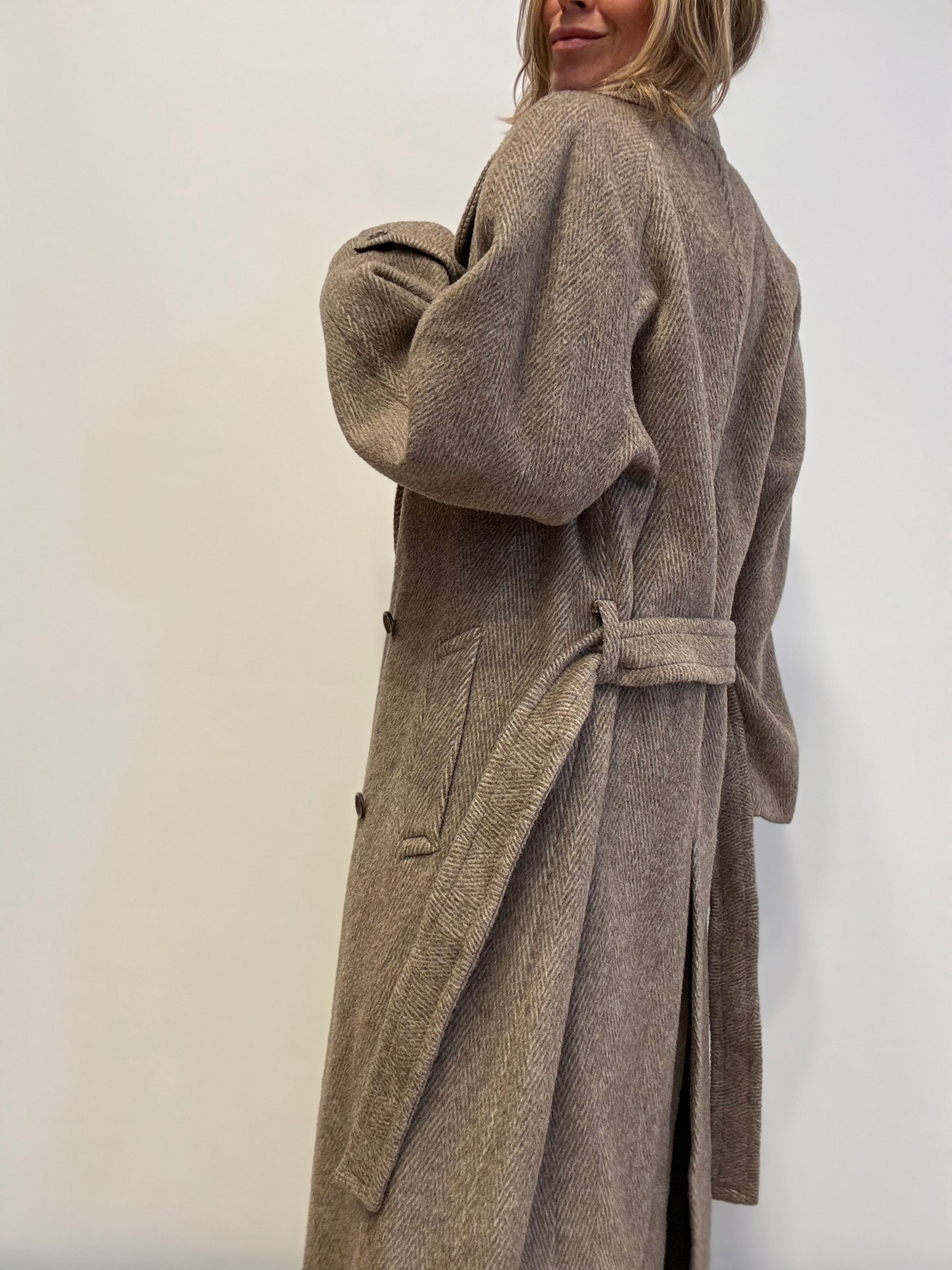 This authentic vintage coat is crafted from a luxurious blend of 50% wool and 50% alpaca, offering both warmth and a soft, refined texture. The fabric features a subtle taupe herringbone pattern, giving the coat a timeless and sophisticated look. Designed with a double-breasted front, wide lapel collar, and matching waist belt, it combines classic tailoring with a relaxed oversized silhouette. Perfect for layering, this coat is an elegant addition to any cold-weather wardrobe.