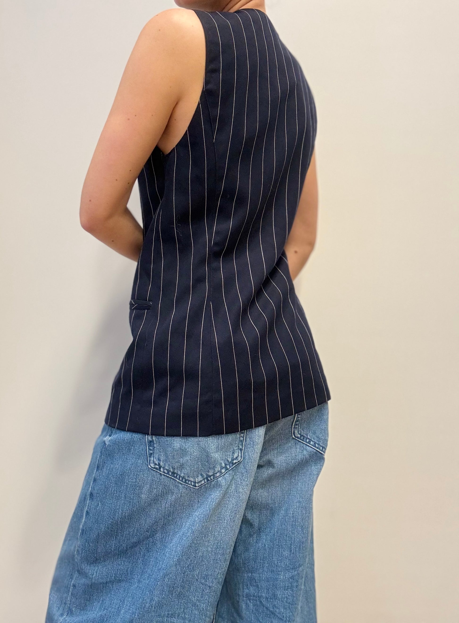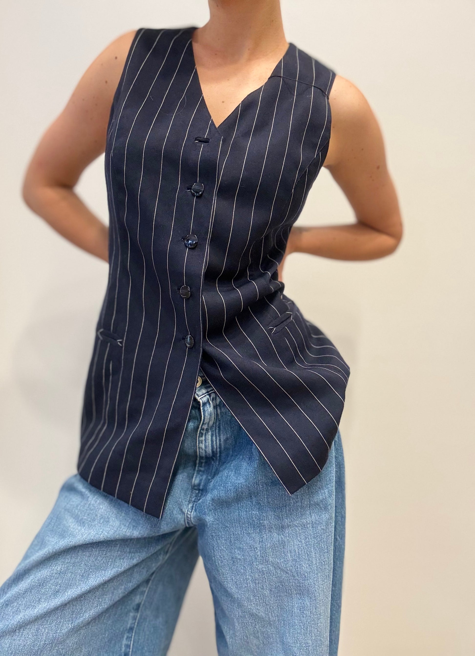 Een tijdloos en elegant vintage gilet in marineblauw met fijne krijtstrepen. Dit mouwloze model heeft een klassieke snit met drie knopen en paspelzakjes aan de voorkant — perfect voor een verfijnde, androgyne look. Draag het op een blote huid voor een moderne twist of over een blouse voor een meer klassieke stijl.