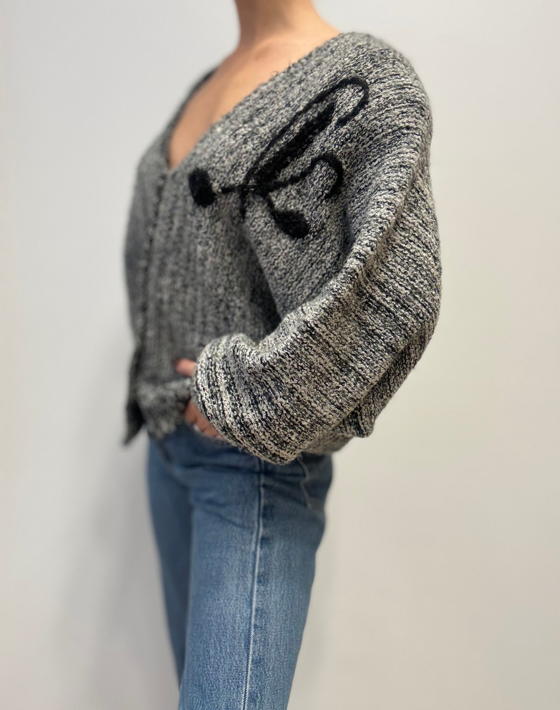 Een uniek vintage vest met een handgemaakte uitstraling, vervaardigd uit een zachte wolmix in gemêleerde grijs-zwarte tinten. Het vest heeft een diepe V-hals en sluit met een subtiel strikkoord met pompondetails op de borst, wat een speelse maar elegante touch geeft. De ruimvallende mouwen en grove breistructuur zorgen voor een nonchalante, cosy fit — ideaal om te dragen over een T-shirt of kanten top voor een moeiteloos stijlvolle look.