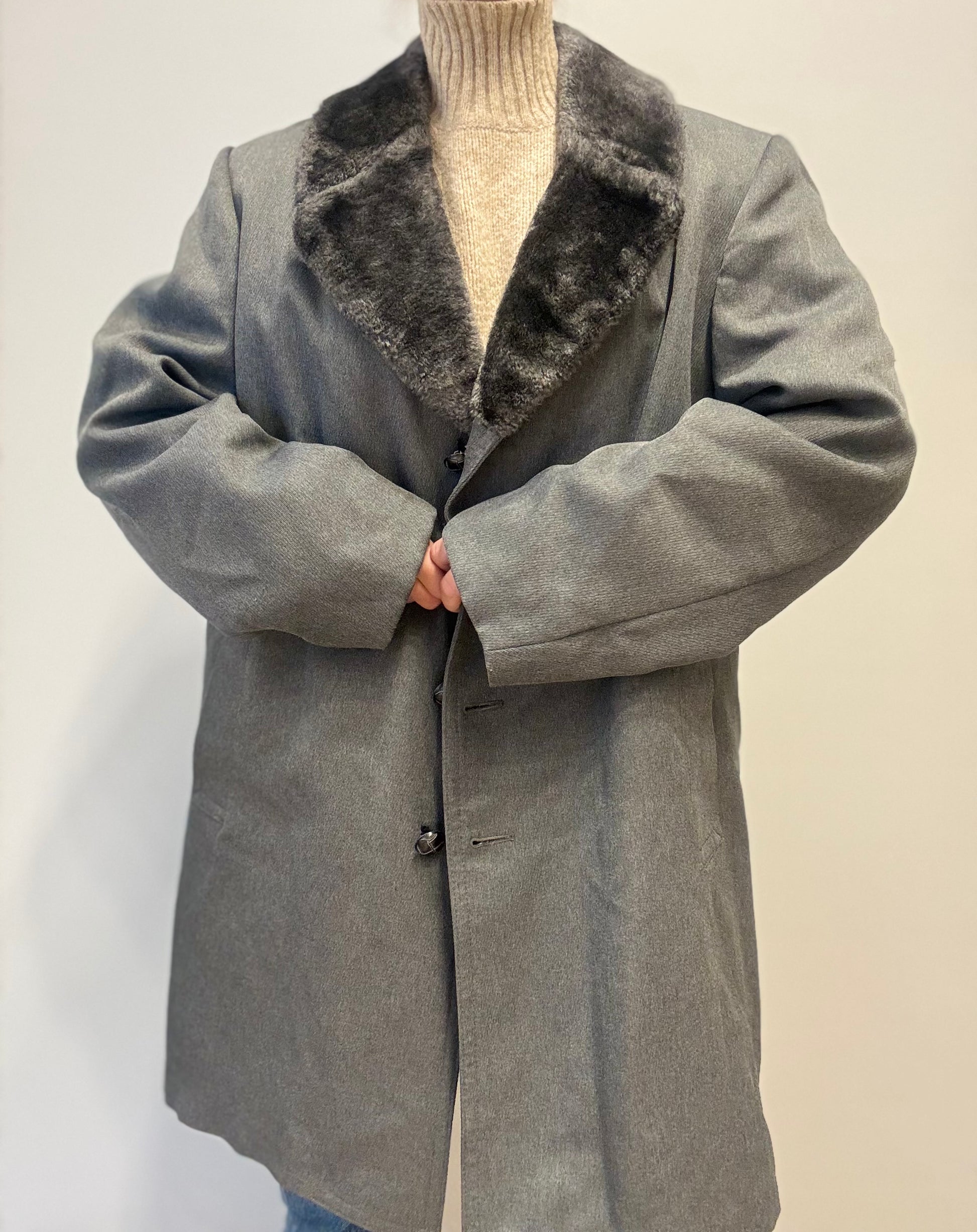 Deze elegante vintage mantel van London Fog straalt tijdloze klasse uit dankzij de gestructureerde pasvorm en de luxe afwerking. Gemaakt van een zachte wolmix in diep antracietgrijs, met een rijke imitatiebontkraag die zowel warmte als verfijning toevoegt. De jas sluit met een rij glanzende knopen aan de voorkant en is volledig gevoerd met imitatiebont, wat zorgt voor ultiem comfort op koude dagen. Een klassiek stuk dat functionaliteit en vintage elegantie perfect combineert.