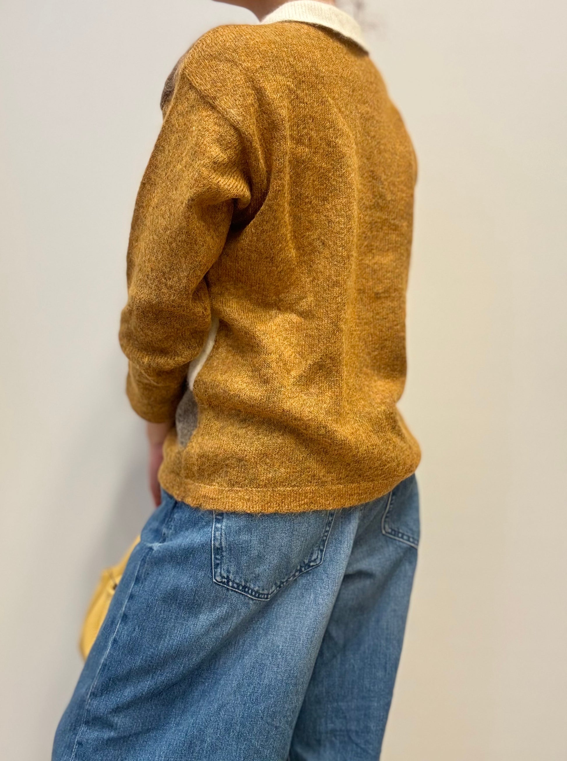 Een unieke vintage trui in warme aardetinten met een grafisch patchworkpatroon en een opvallend geborduurd motief van een eend in vlucht. De combinatie van zachte kleuren zoals bruin, oker, wit en groen geeft de trui een speelse, retro uitstraling. De hoge, omgeslagen kraag in contrasterend crème maakt het geheel af met een cozy touch.