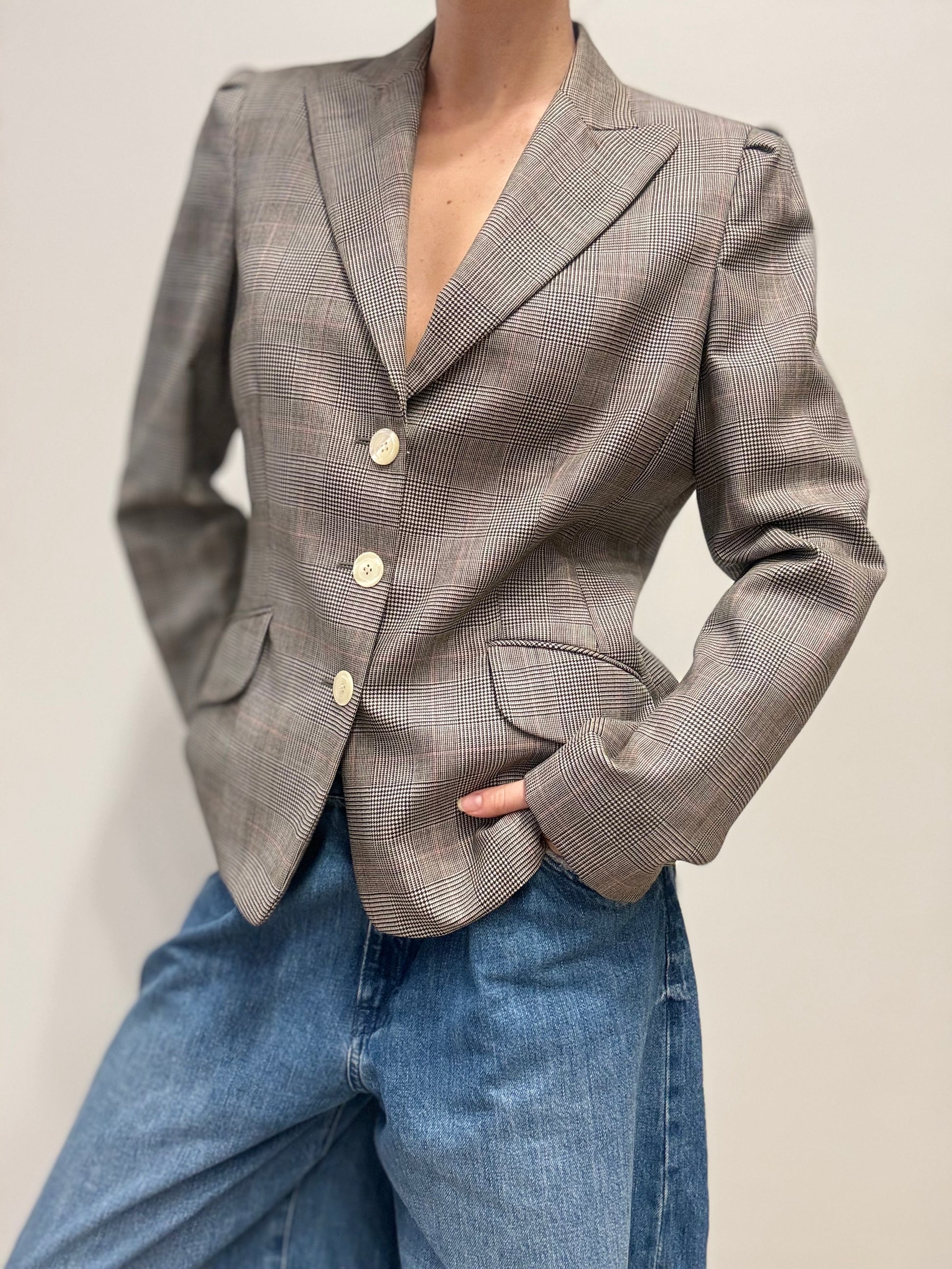 Deze elegante vintage blazer heeft een klassiek ruitpatroon in zachte grijs- en beigetinten. De blazer is mooi getailleerd en benadrukt de taille, terwijl de licht gepofte schouders zorgen voor een krachtige, vrouwelijke uitstraling. Een tijdloos item dat zowel chic als casual gestyled kan worden.
