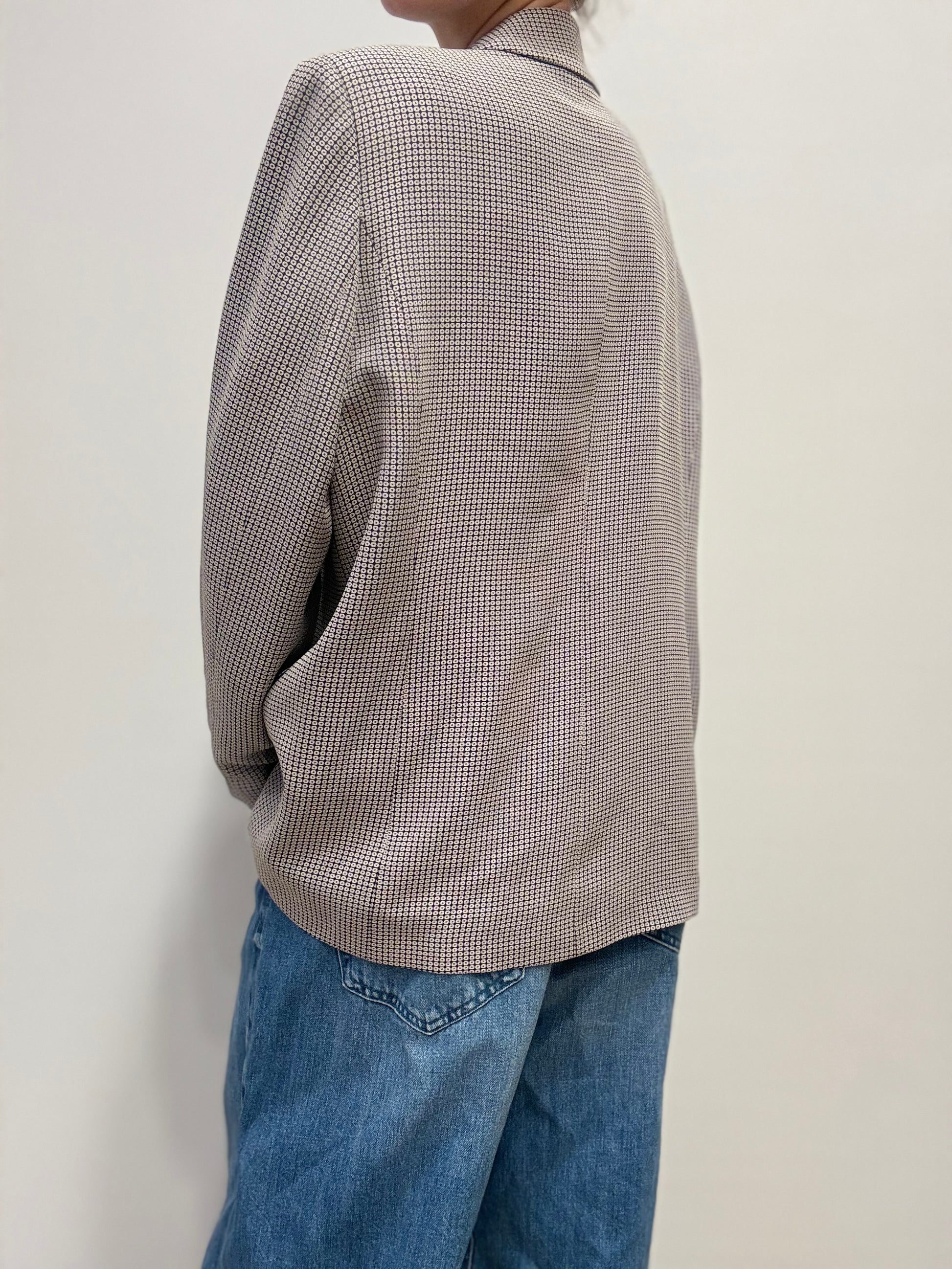 Deze stijlvolle vintage blazer heeft een verfijnde uitstraling dankzij het fijne grijs-zwarte micro-patroon. De blazer heeft een klassieke reverskraag en een licht getailleerde pasvorm, waardoor hij zowel chic als makkelijk draagbaar is. Perfect te combineren met denim voor een moderne look of juist netjes voor een zakelijke outfit.