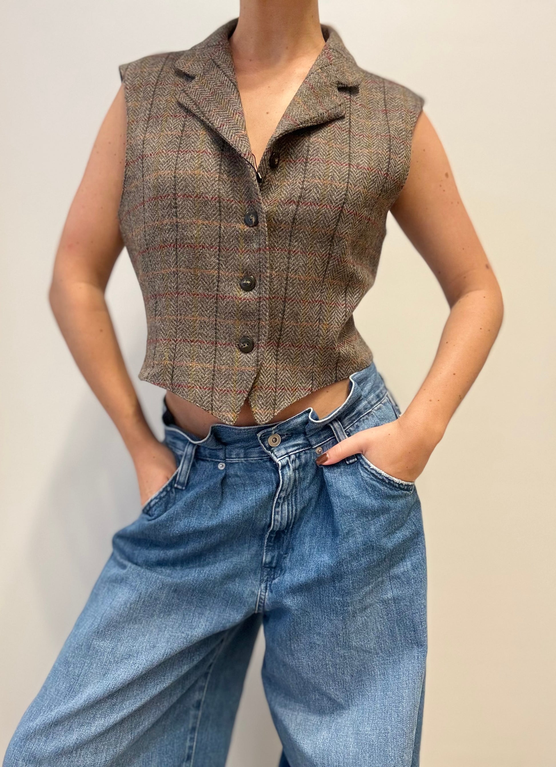 This elegant vintage waistcoat from Max Mara is crafted from a luxurious wool blend in a timeless checked tweed pattern. Featuring warm earthy tones with subtle red and mustard accents, the piece combines refined tailoring with a feminine silhouette. The structured fit, notched lapel collar, and button-down front add a touch of classic sophistication — perfect for layering over shirts or under blazers.