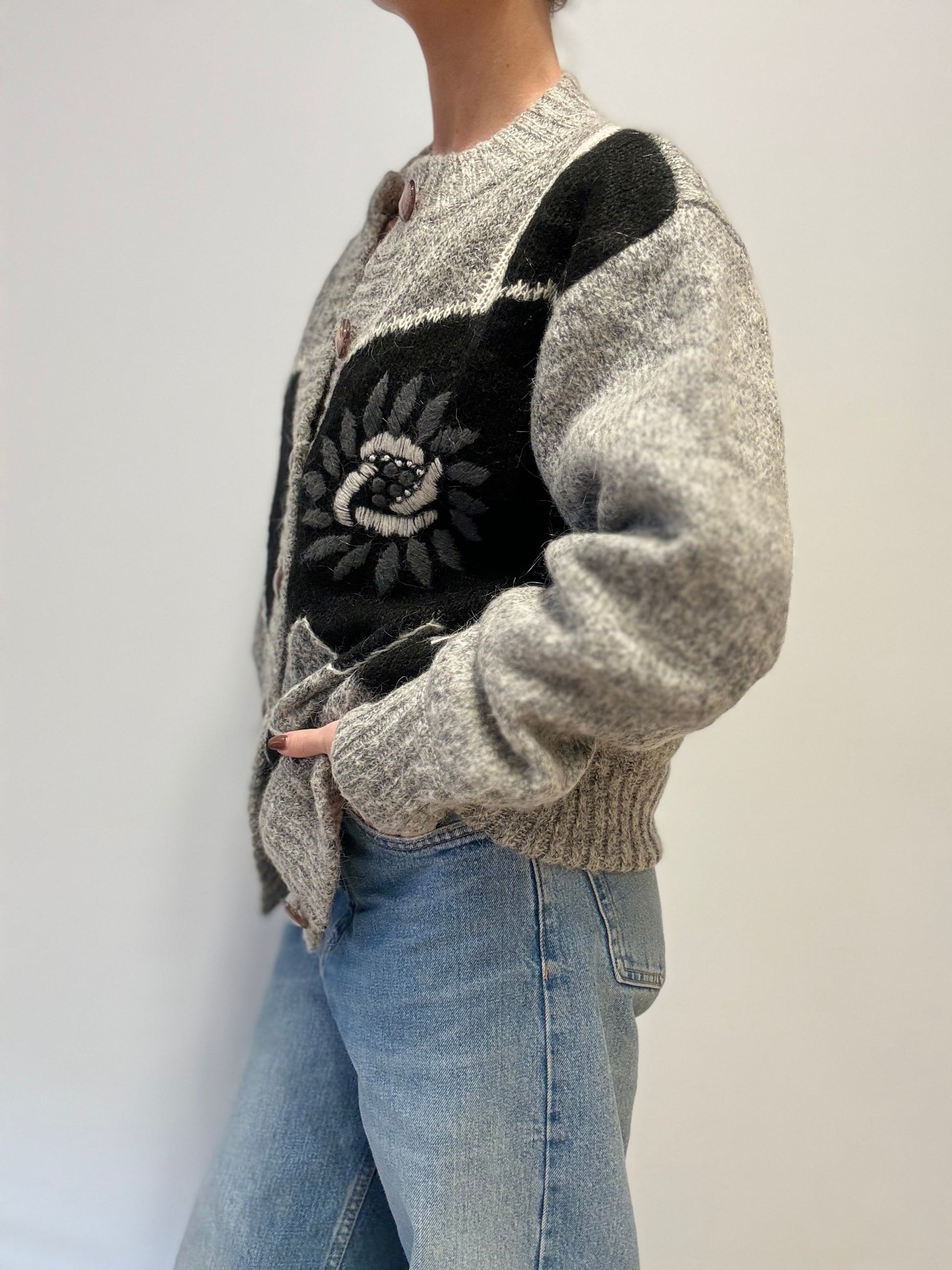 Jan Eva Gebreid Vest met Bloemenmotief – Grijs/Zwart