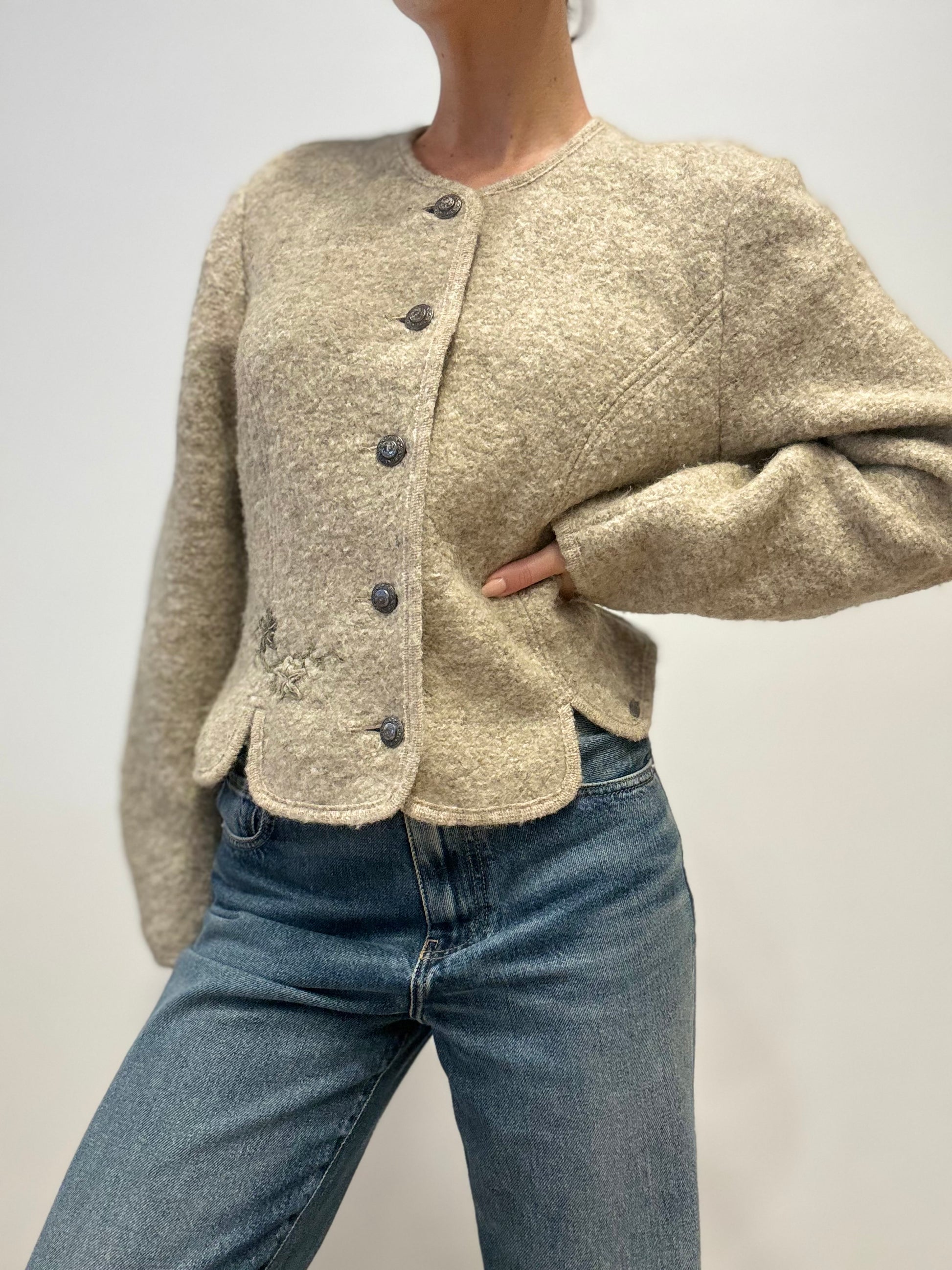 This authentic vintage Giesswein jacket, made in Austria, is crafted from 90% pure new wool and 10% polyamide. The piece features a beautifully tailored fit with scalloped hem details and traditional embossed metal buttons. A subtle embroidered floral motif at the waist adds a touch of alpine charm, while the soft boiled wool texture offers both warmth and structure — a timeless blend of elegance and coziness.