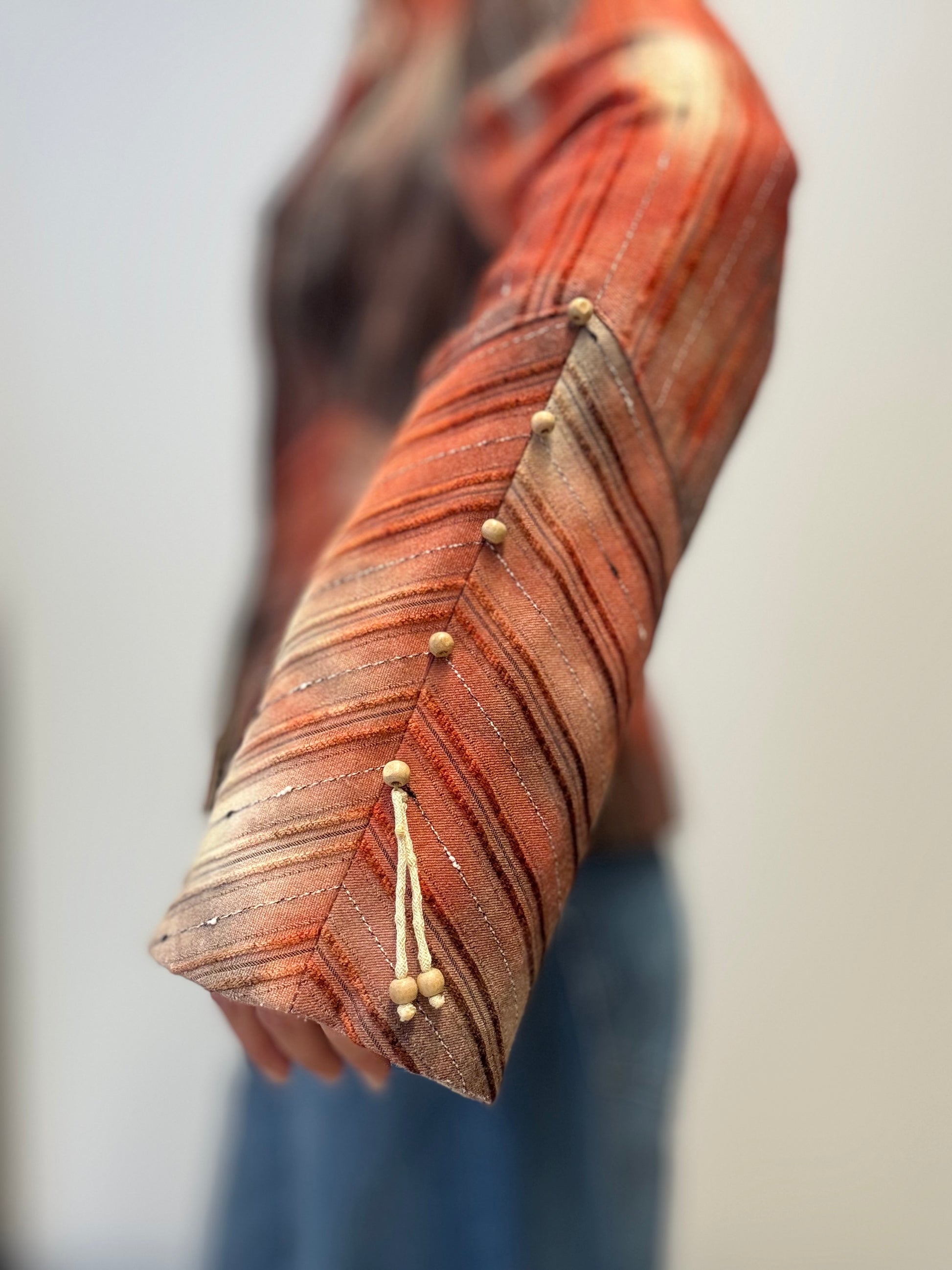 Deze authentieke vintage blazer is gemaakt van een lichte geweven stof met een opvallend streeppatroon in warme aardetinten zoals roest, taupe en bruin. Een subtiele metallic draad geeft de stof een elegante glans. De getailleerde snit, spitse kraag en knoopsluiting aan de voorkant zorgen voor een flatterend silhouet, terwijl het patroon een speelse retro-uitstraling toevoegt. Perfect te combineren met denim voor een casual look of als statement piece voor een meer geklede outfit.