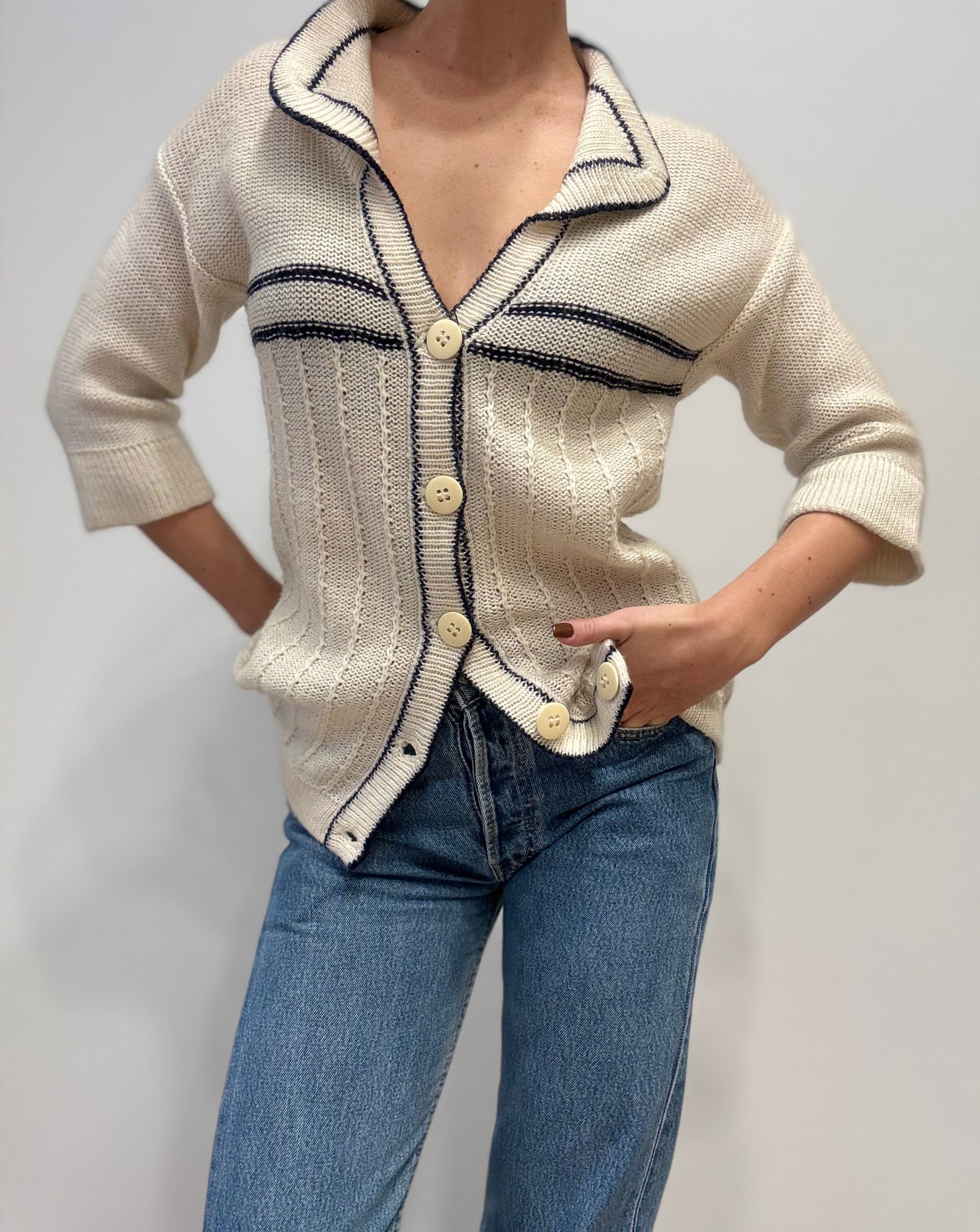 Dit charmante vintage vest is gemaakt van een zachte gebreide katoenmix in een crèmekleurige tint met subtiele donkerblauwe strepen langs de randen en boorden. De verticale kabelstructuur geeft het vest een verfijnde, handgemaakte uitstraling, terwijl de lichte stof zorgt voor een comfortabel en ademend draaggevoel. Het vest sluit met klassieke crème knopen en heeft een tijdloze, nonchalante pasvorm – ideaal om te dragen over een blouse of een simpel T-shirt.