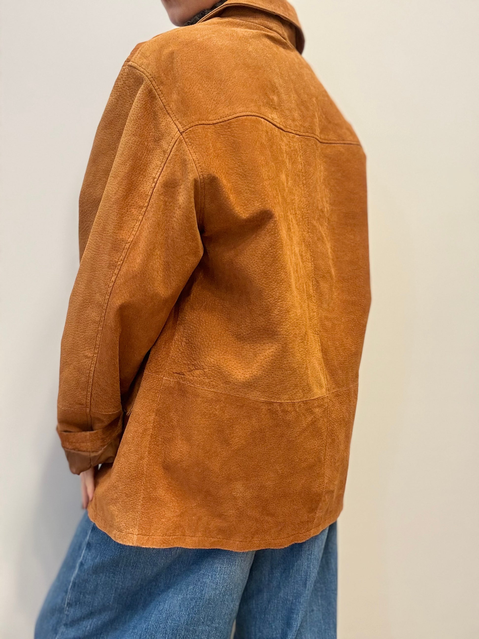 Een stijlvolle vintage jas in warme cognackleur, met een luxueuze suède look en een klassiek, recht model. De jas heeft een minimalistisch design met grote zakken, een kraag en ton-sur-ton knopen, wat zorgt voor een tijdloze uitstraling met een retro knipoog. Perfect te combineren met denim of lichte tinten voor een elegante, herfstige look.