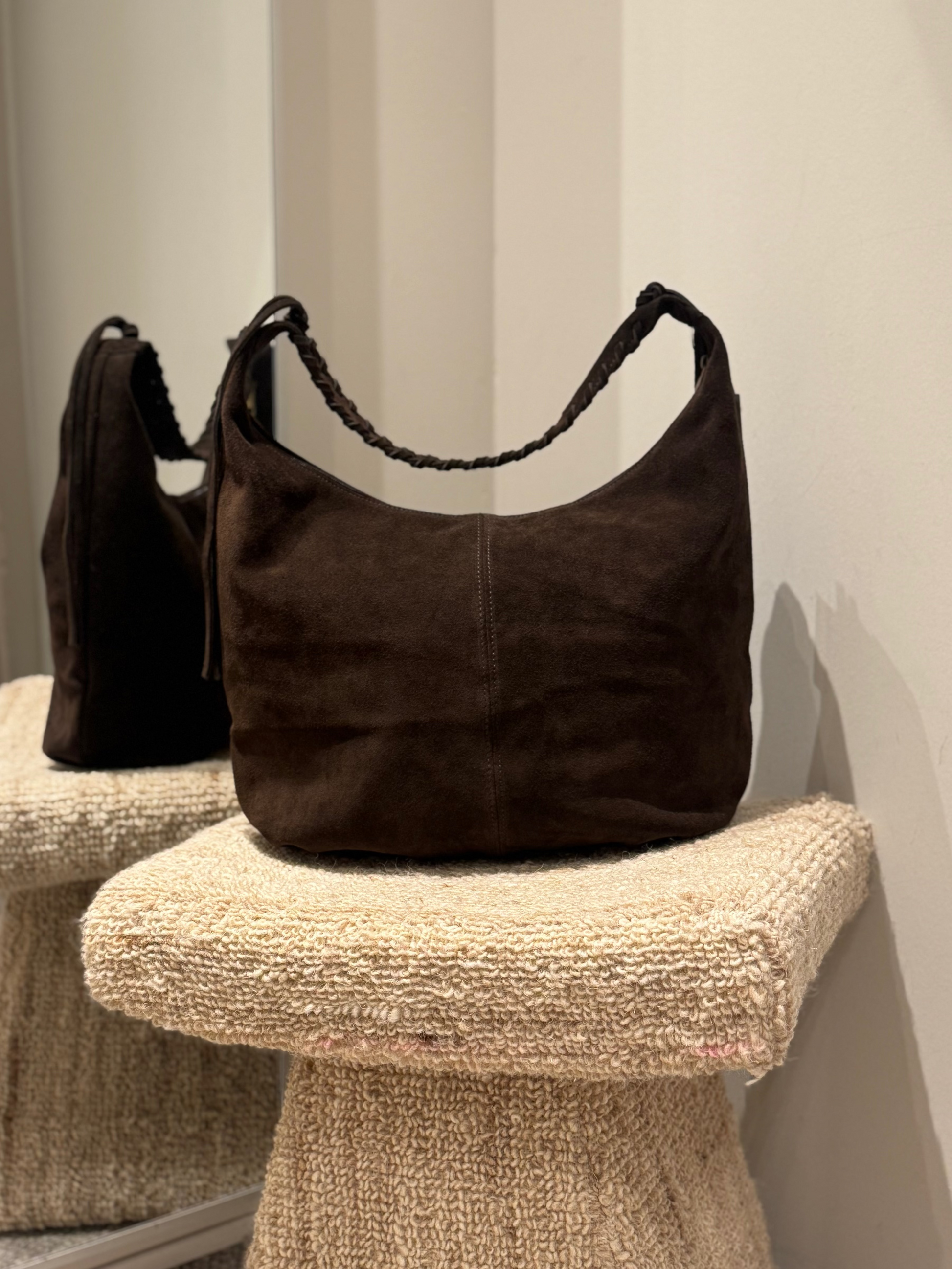 De donkerbruine AVEA is warm, klassiek en stijlvol. De rijke chocoladebruine tint maakt deze tas tijdloos en combineerbaar met vrijwel alles, van denim tot wol en van lichte tinten tot diepe herfstkleuren. Het suède voelt zacht aan en vormt een prachtig contrast met de robuuste hand gevlochten band.
