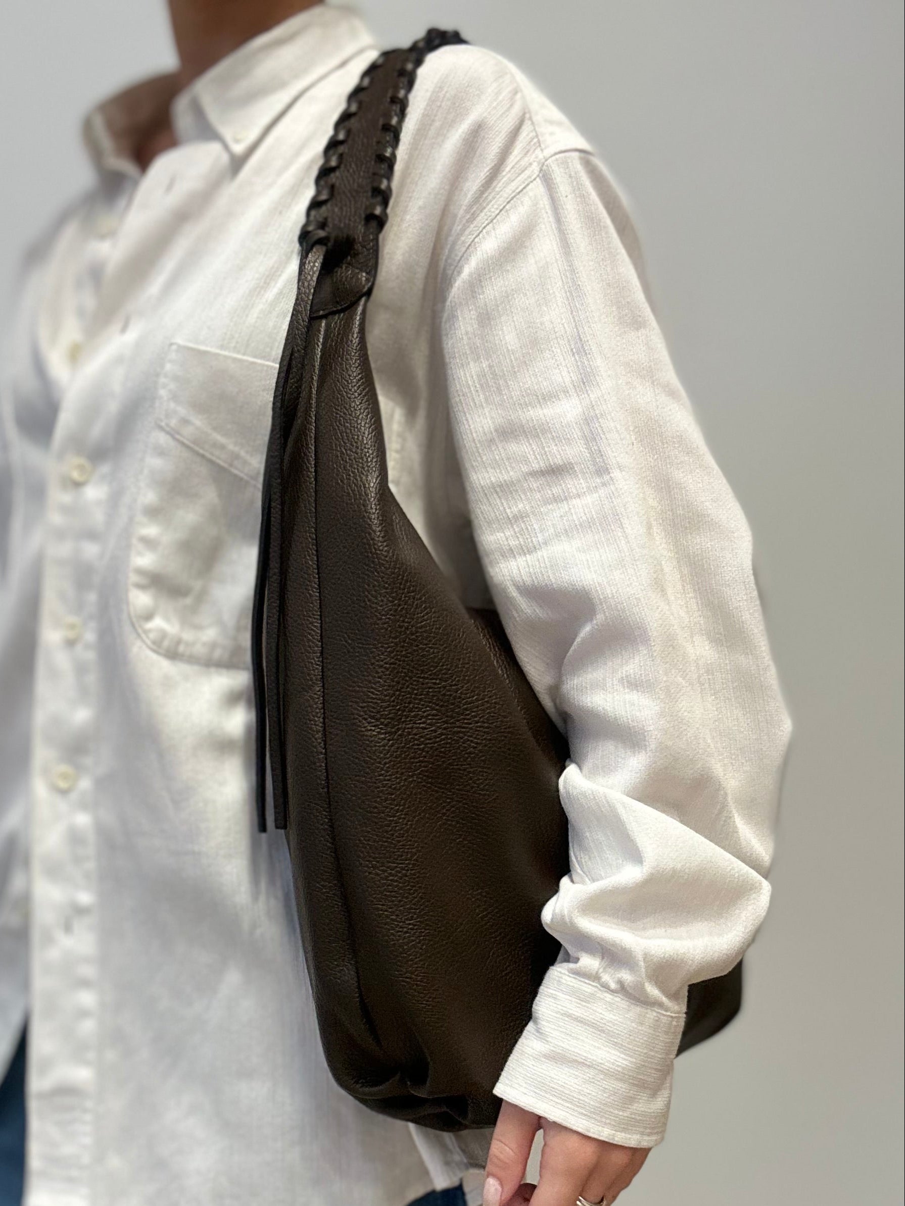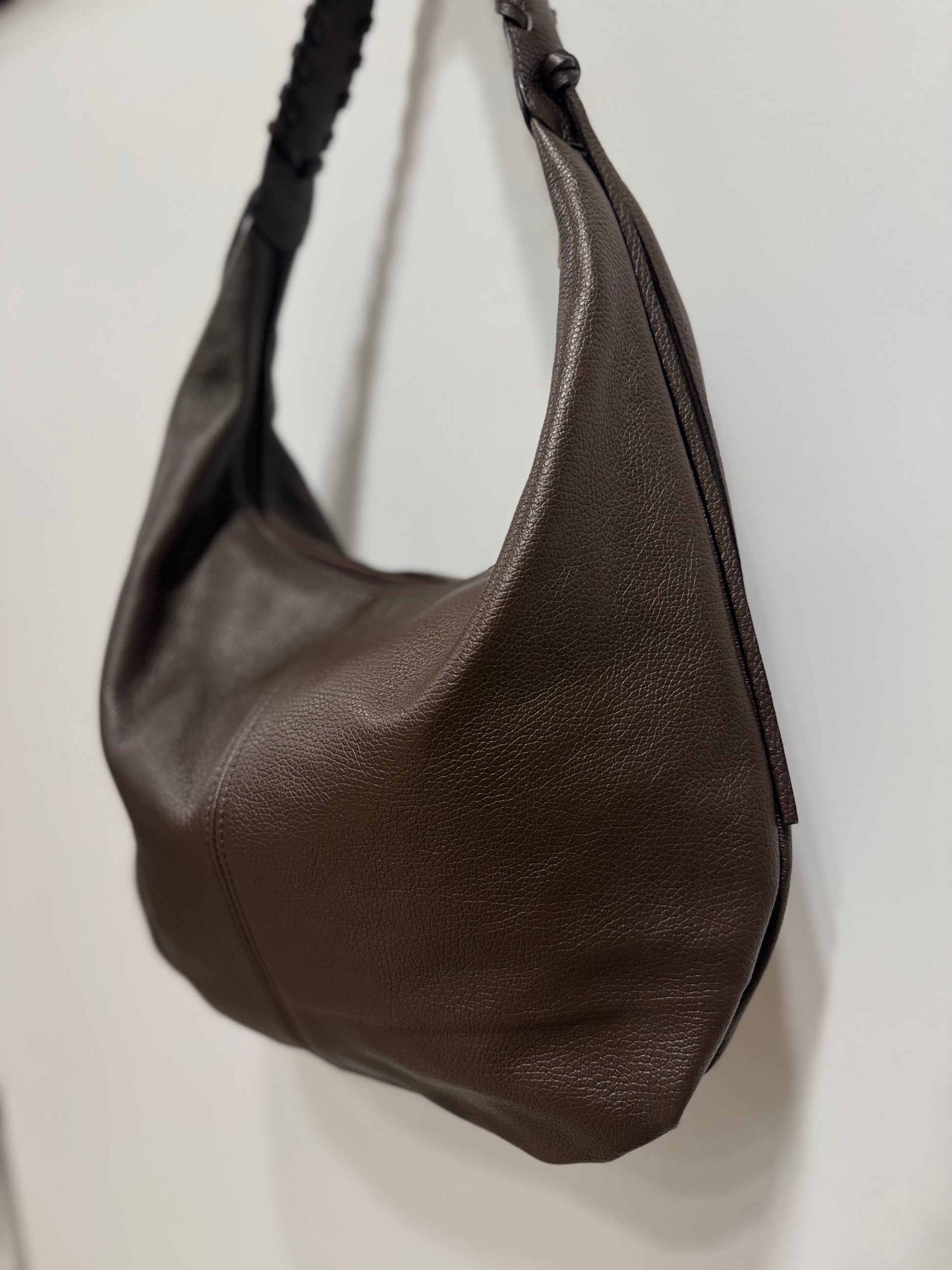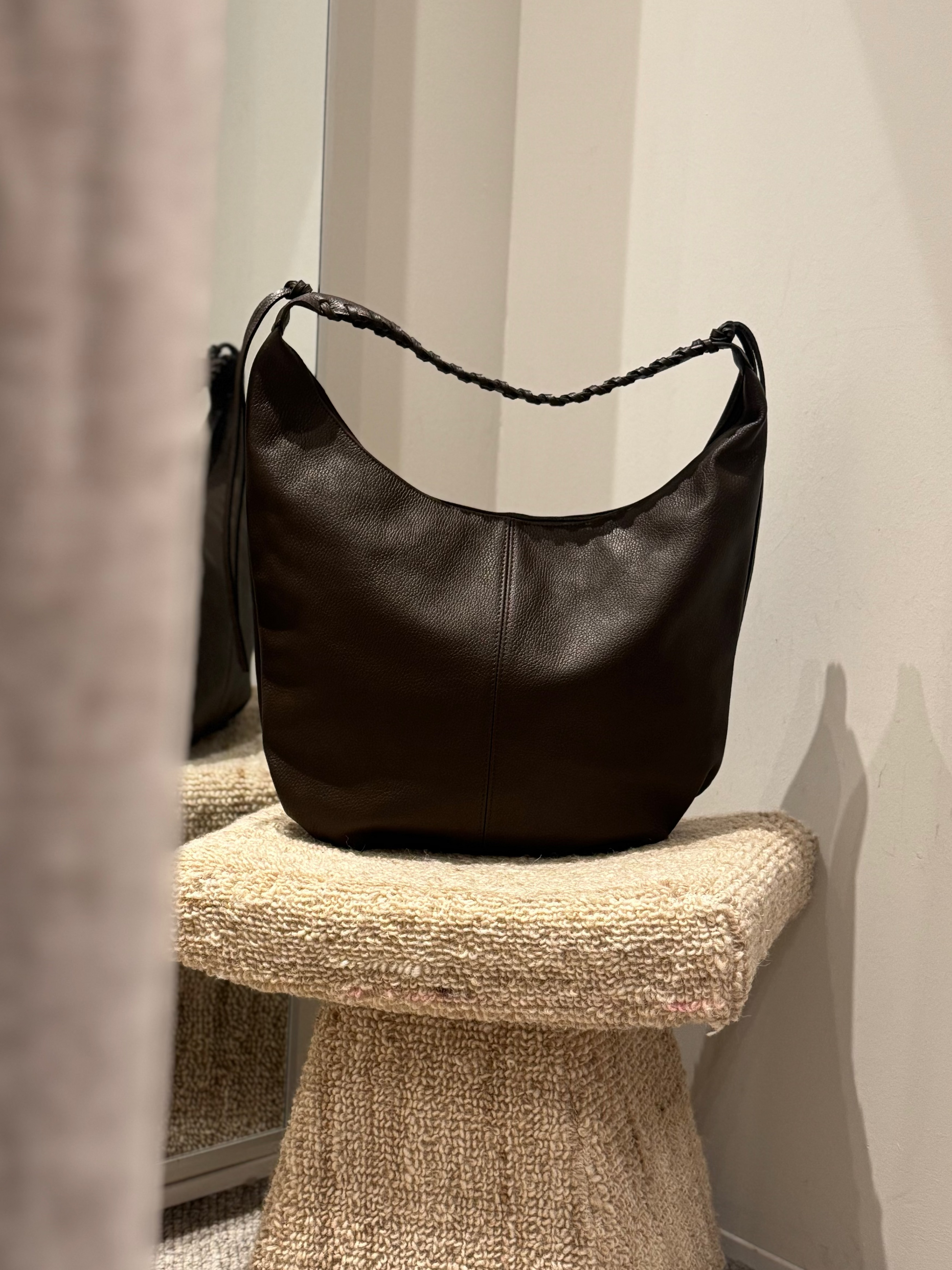 De donkerbruine leren AVEA heeft een rijke, diepe tint die het prachtige generfde leer extra laat spreken. Dit model straalt luxe uit zonder opvallend te zijn, precies de verfijning waar YENVI voor staat. De zachte hobo-vorm maakt deze tas heerlijk draagbaar, terwijl het stevige leer zorgt voor een mooie structuur en duurzaamheid.
