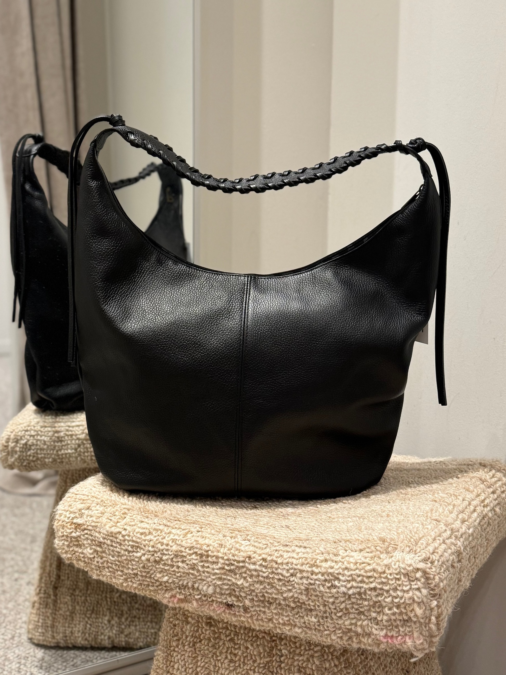 De AVEA in zwart generfd leer is de ultieme moderne klassieker, strak, luxe en moeiteloos chic. Het stevige, maar soepele leer heeft een subtiele structuur die de tas een premium uitstraling geeft. De gevlochten band voegt een ambachtelijk detail toe, terwijl de vorm zacht en comfortabel blijft.