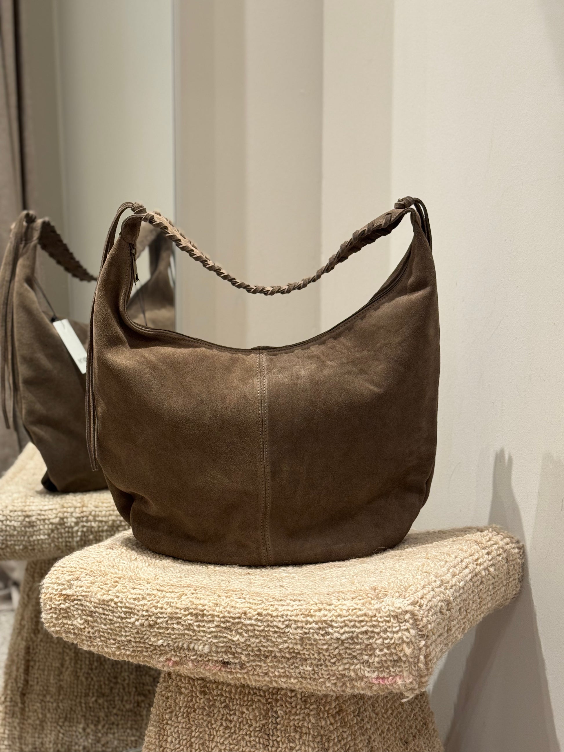 De AVEA-tas in taupe suède is een zachte, elegante basic die werkelijk overal bij past. Deze kleur heeft een rustige, verfijnde uitstraling en laat het luxueuze karakter van het suède volledig tot zijn recht komen. De met de hand gevlochten band en zachte, organische vorm maken dit een tijdloze tas die je moeiteloos dagelijks kunt dragen.