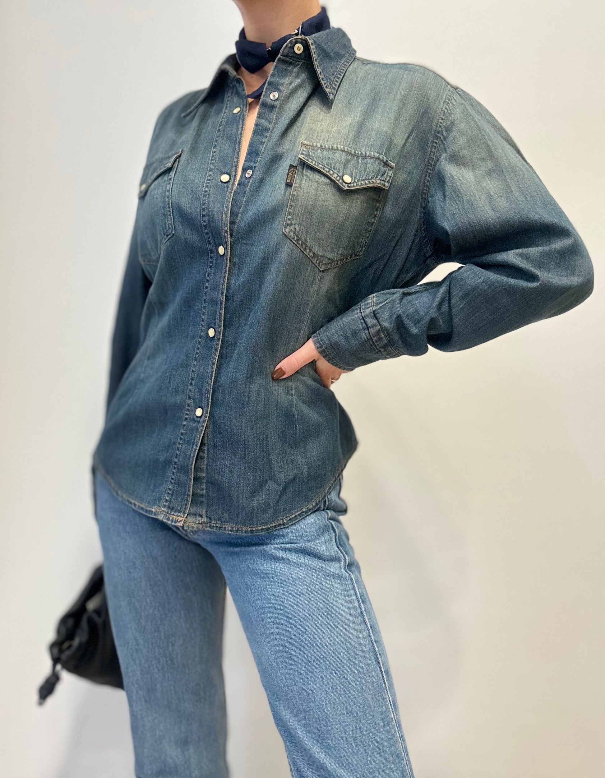 This timeless vintage denim shirt captures the essence of effortless Western style. Made from soft yet durable cotton denim, it features snap button closures, flap chest pockets, and subtle fading for an authentic worn-in look. Its relaxed fit and sturdy structure make it a perfect layering piece, adding a touch of casual sophistication to any outfit.