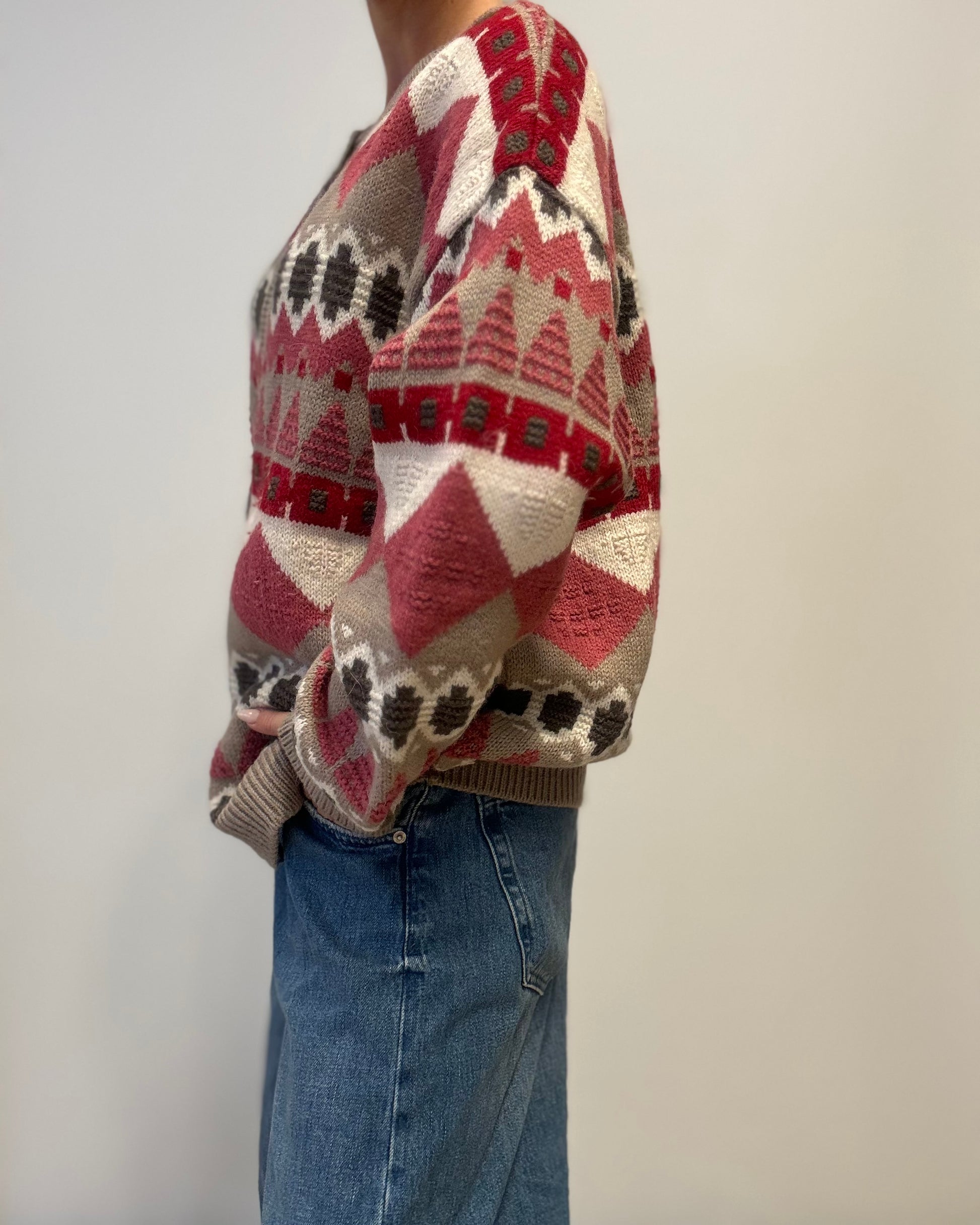 Vintage Geometric Knit Cardigan in Red & Taupe