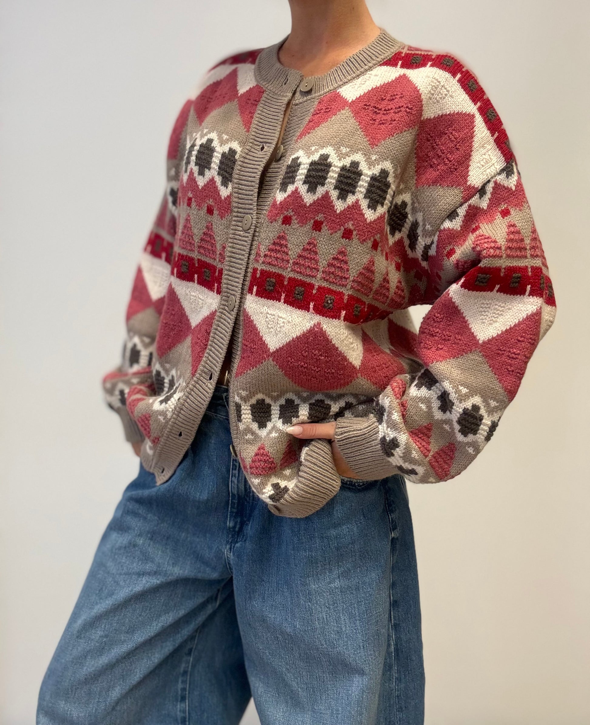 This authentic vintage cardigan is crafted from a soft knit fabric and features a bold geometric pattern in warm tones of red, taupe, black, and cream. Designed with a relaxed fit, ribbed trims, and a round neckline, it combines cozy comfort with a striking graphic look. The button-down front makes it easy to layer over casual outfits, perfect for adding a retro touch to your everyday wardrobe.