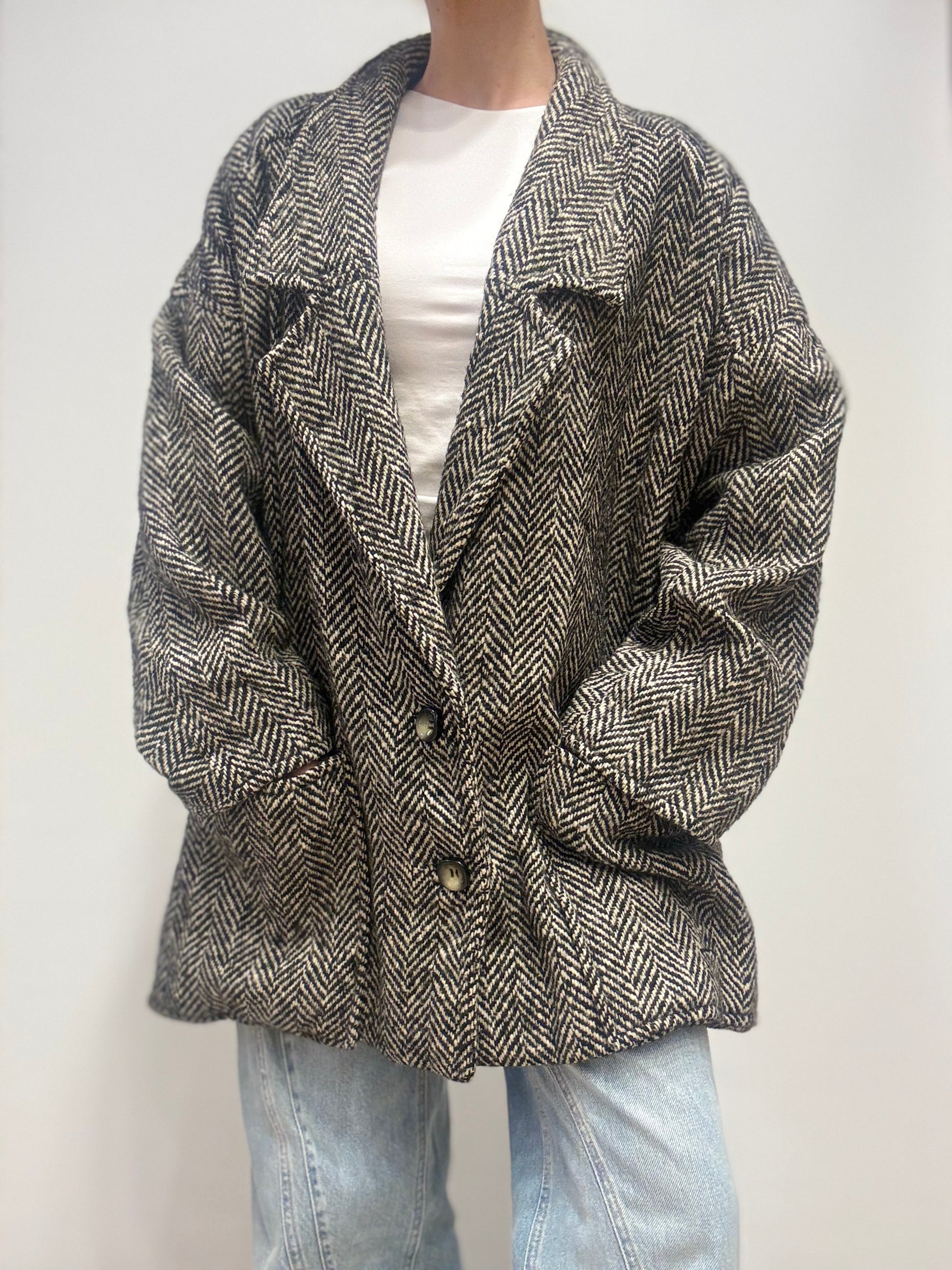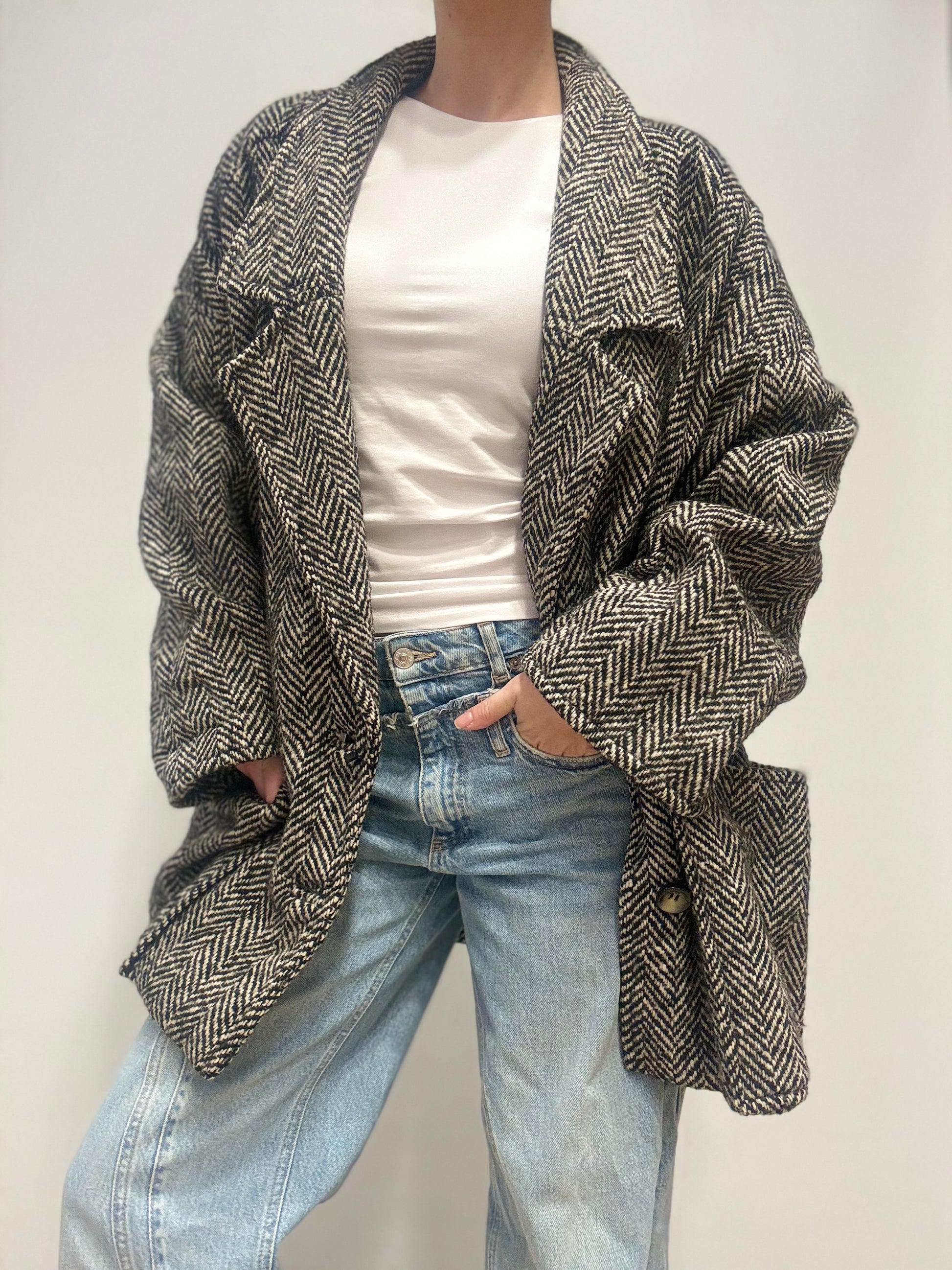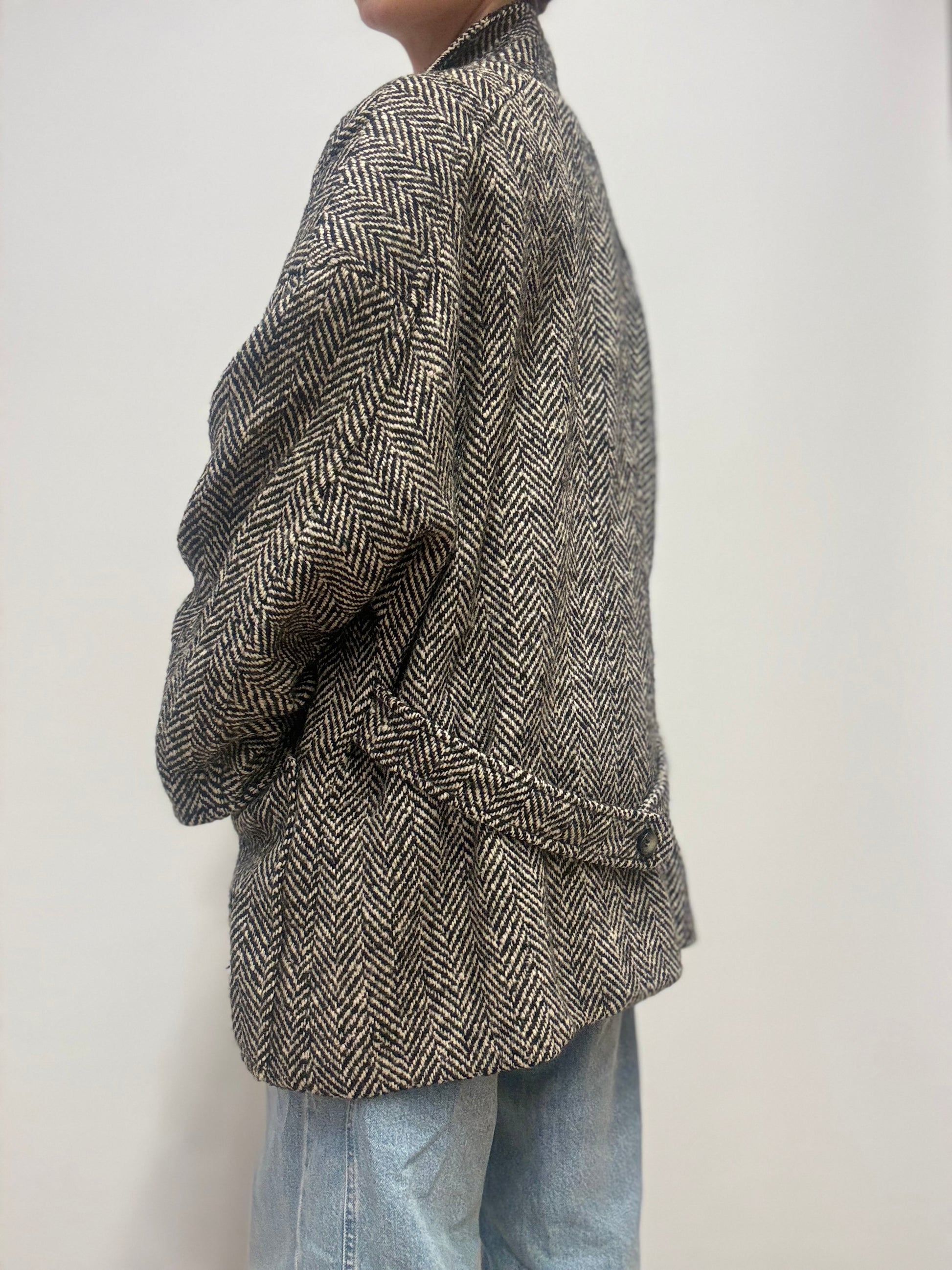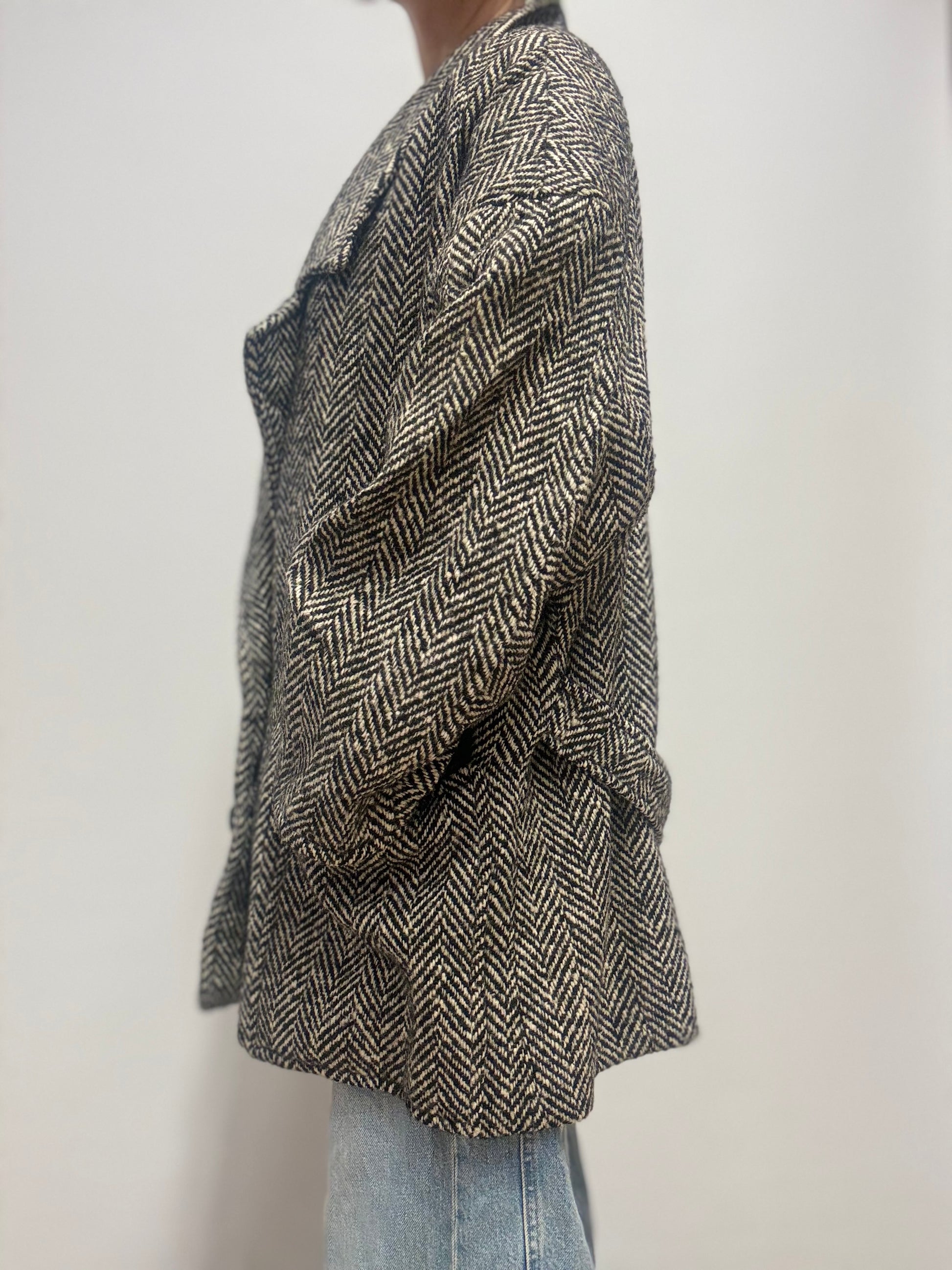 Deze kortere vintage jas in een klassieke visgraatstructuur is een tijdloos stuk dat overal bij past. De zware, compacte wolkwaliteit geeft hem een luxe, stevige feel, terwijl de kortere lengte zorgt voor een moderne, frisse look. Perfect te combineren met denim of een nette pantalon.