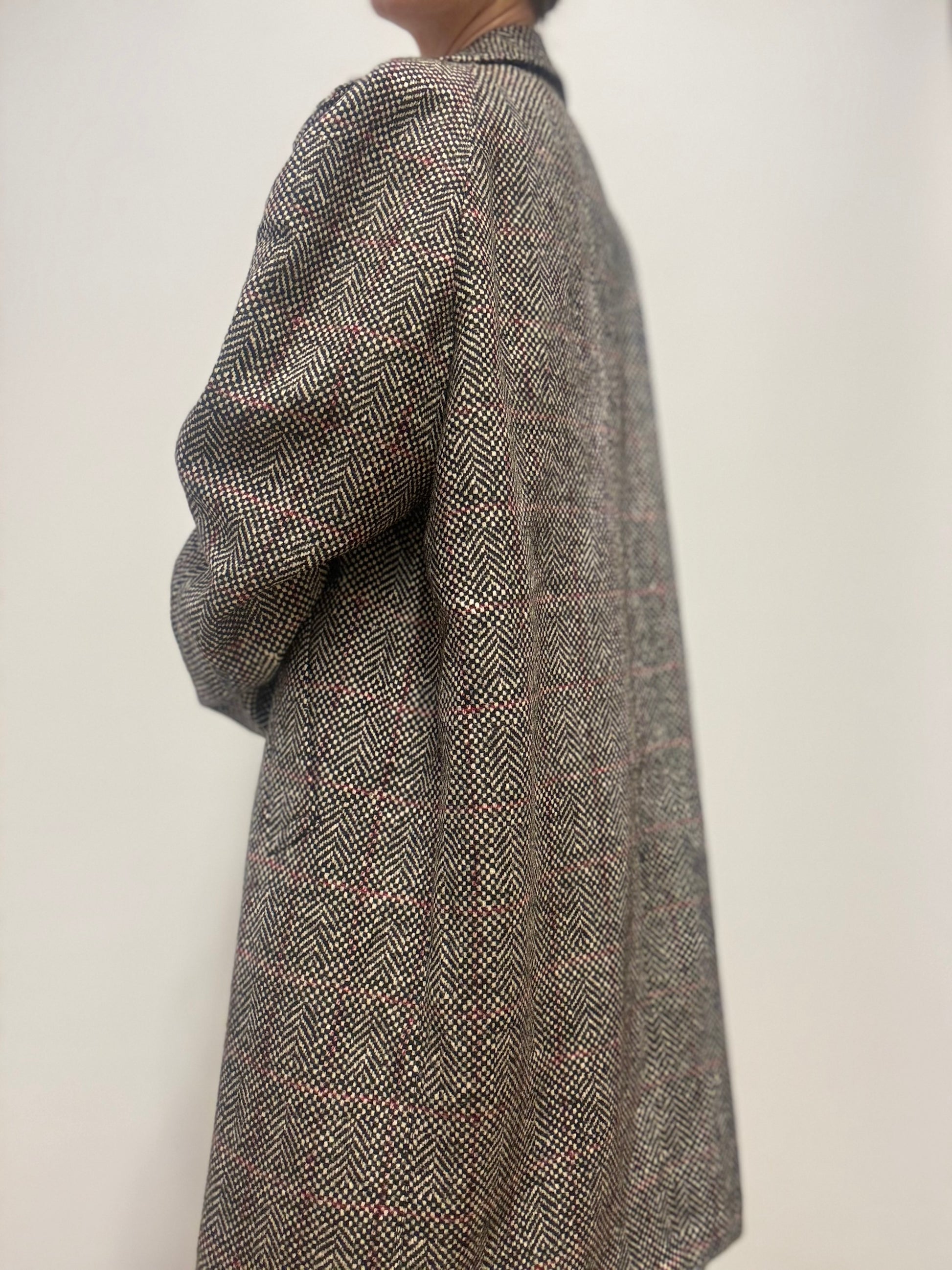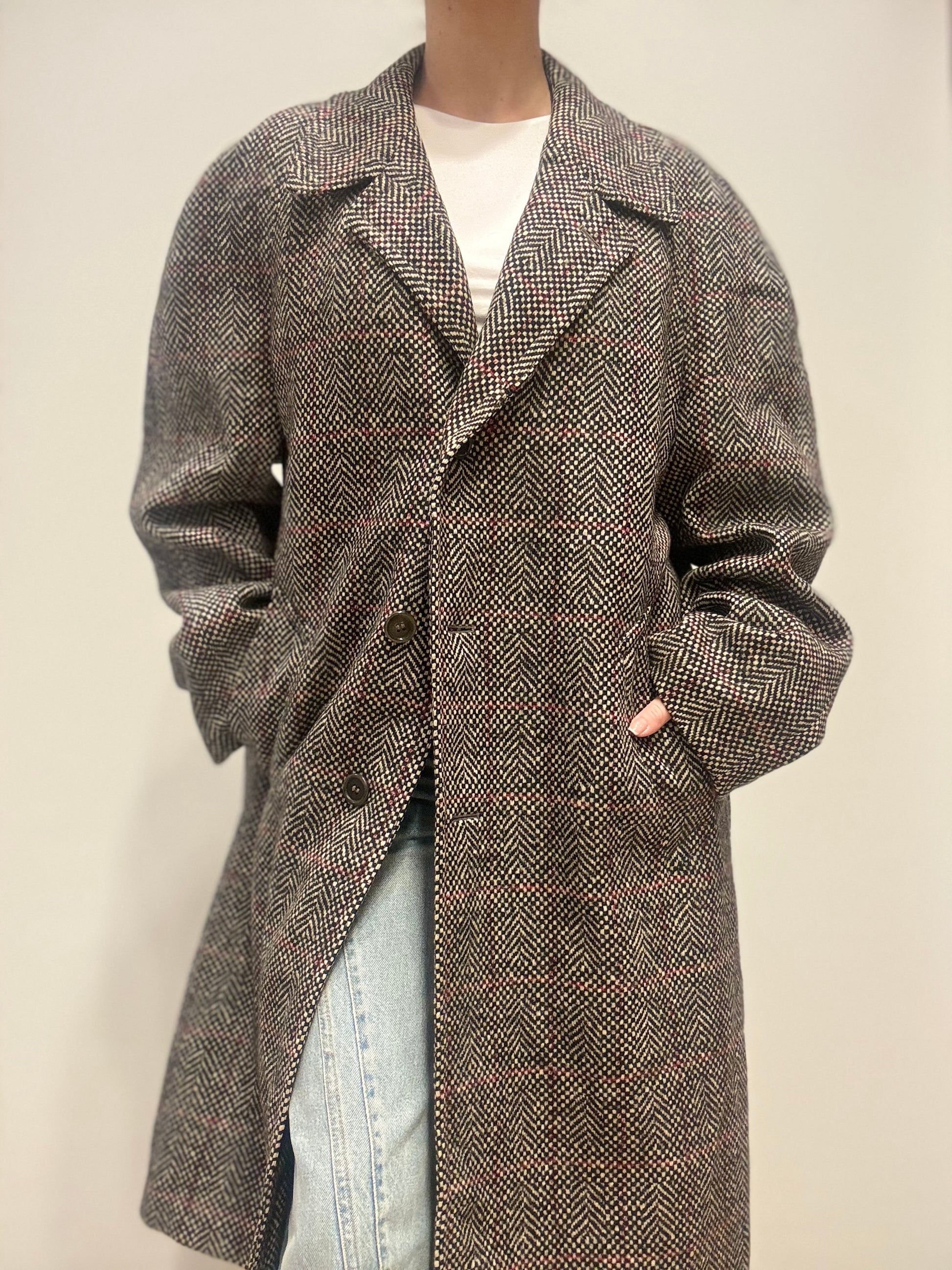 Deze prachtige vintage jas heeft een klassiek visgraatpatroon met subtiele rode ruitlijnen die het geheel een tijdloze, Engelse country-look geven. De zware wollen kwaliteit zorgt voor warmte en structuur, terwijl de rechte fit het model een nonchalante maar stijlvolle uitstraling geeft.