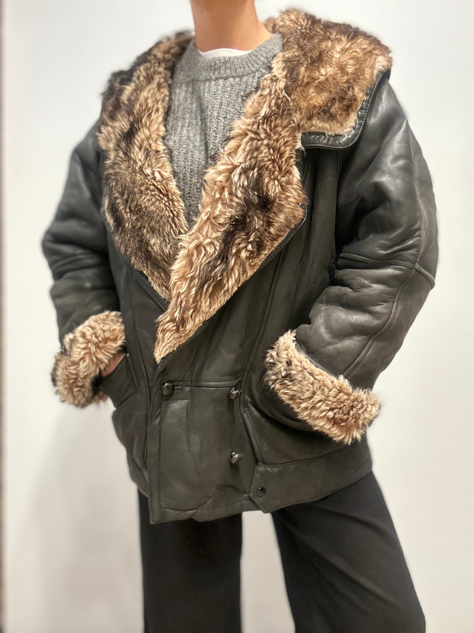 Deze vintage leren jas straalt pure retrocoziness uit dankzij de rijke faux fur voering. Gemaakt van soepel, diepzwart leer, biedt deze jas zowel warmte als een stijlvolle, stoere uitstraling. De brede kraag en manchetten zijn afgewerkt met zachte bruine imitatiebont, wat een luxueus contrast vormt met het gladde leer. De relaxte pasvorm en diepe zakken maken hem perfect voor koude dagen — een echte statement coat met vintage karakter.