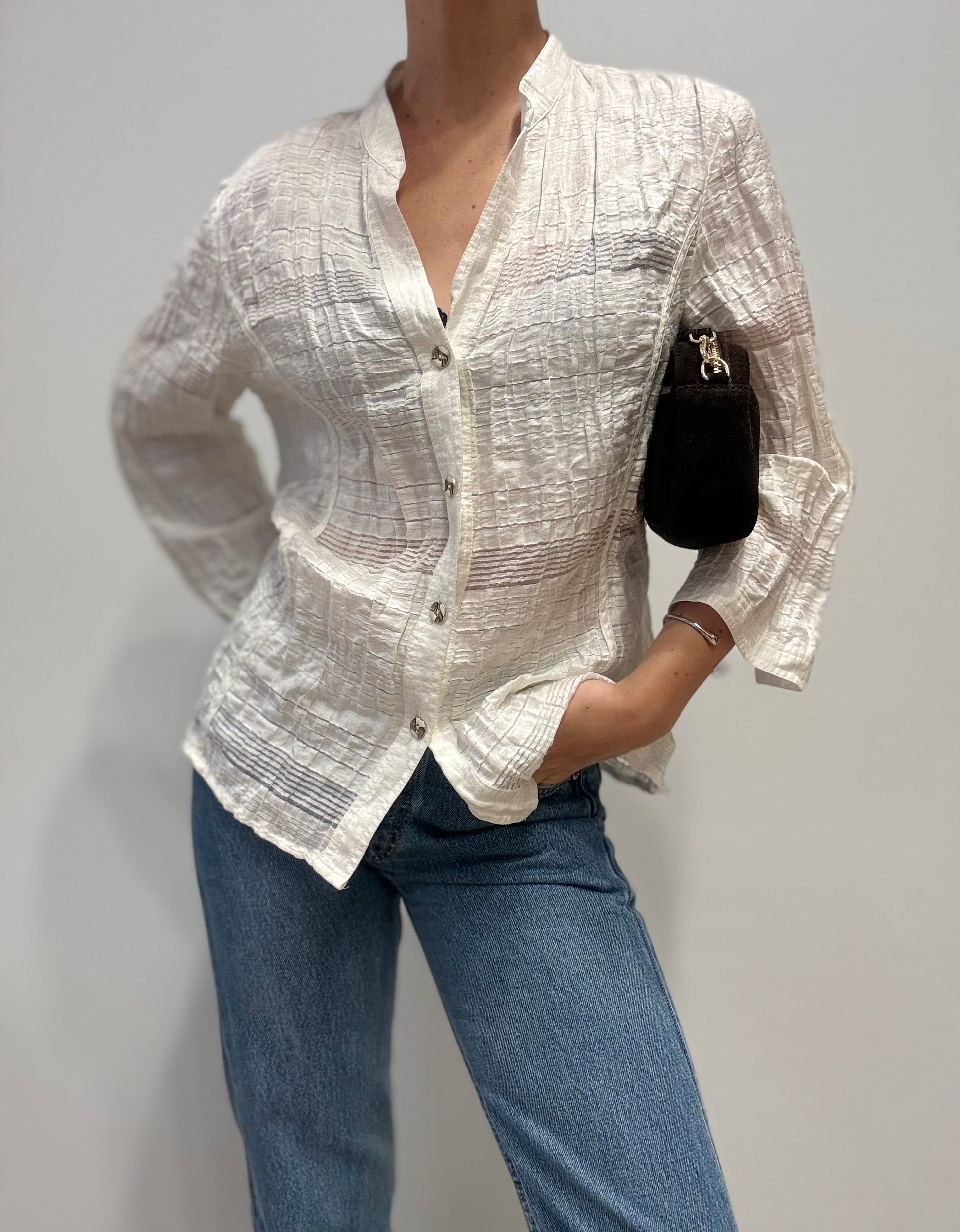 This elegant vintage blouse is crafted from a luxurious linen-viscose blend with a unique textured finish. Its semi-sheer fabric and soft sheen give it a sophisticated yet relaxed feel. The blouse features a mandarin collar and delicate front button closure, perfect for effortless styling — whether tucked into high-waisted jeans or paired with tailored trousers.