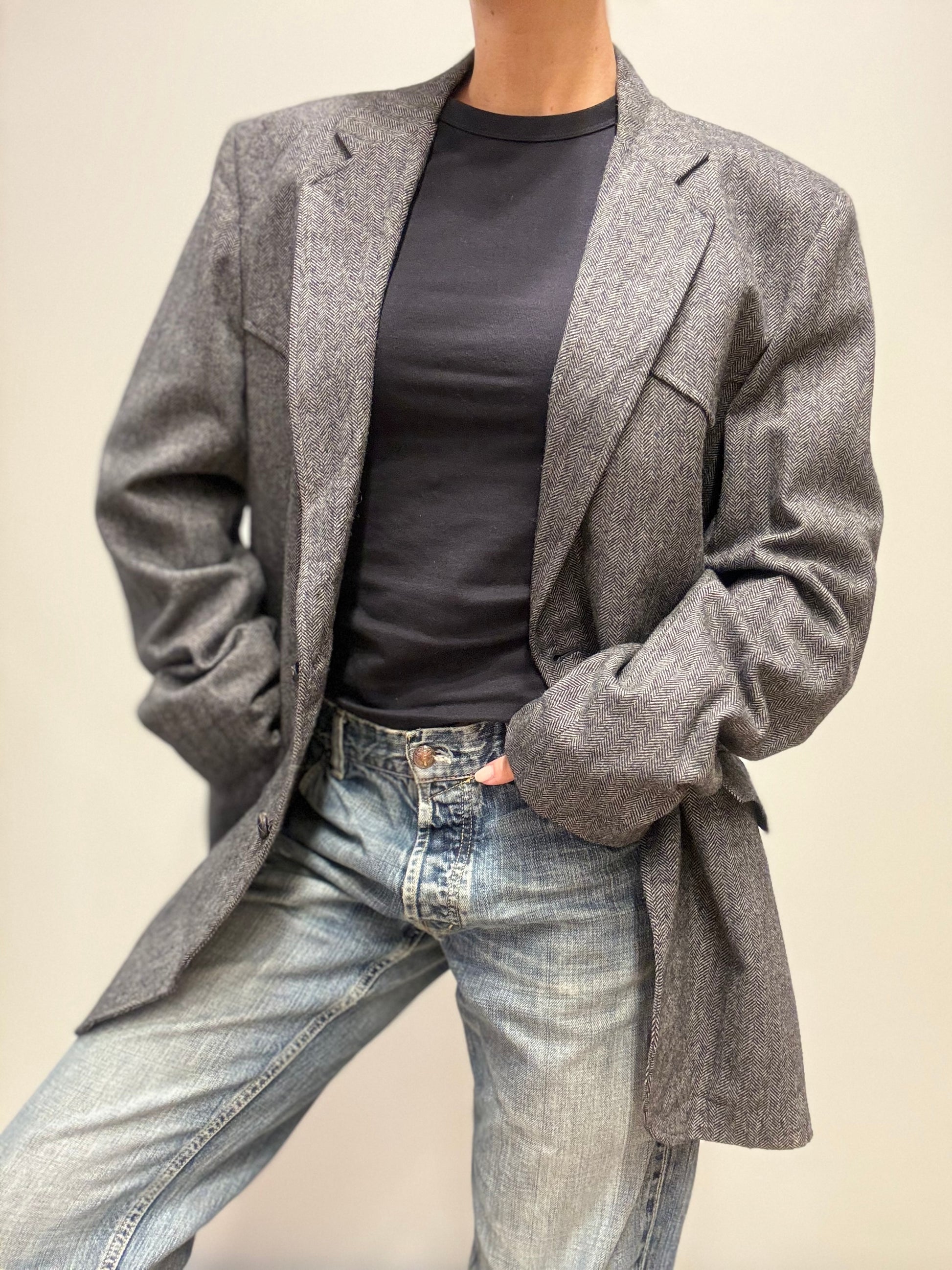 Deze tijdloze grijze blazer is uitgevoerd in een klassiek visgraatmotief en heeft een relaxed, iets oversized pasvorm. De blazer is afgewerkt met een reverskraag, klepzakken en een enkele knoopsluiting, wat zorgt voor een moeiteloos stijlvolle uitstraling. Perfect te dragen over een basic top voor een nonchalante, moderne look.